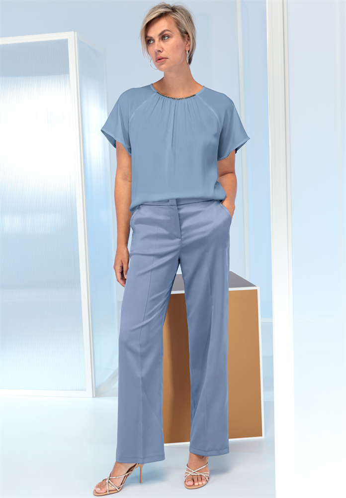 Unser neues Blusenshirt Josy verzaubert mit einem Mix aus Webstoff und Jersey. Das Vorderteil und die weit fallenden Ärmel sind aus matt glänzendem Stoff, das Rückenteil ist aus einem softem Viskose-Elasthan-Mix. Feminine Details wie die kleine Kräuselpartie, das Schmuckelement am Ausschnitt und die kleinen Schlitze am Saum machen Josy zu etwas Besonderem. Stylen Sie sie mit ihrer Lieblingshose für das nächste Event oder ganz einfach mit Jeans für den Alltag!