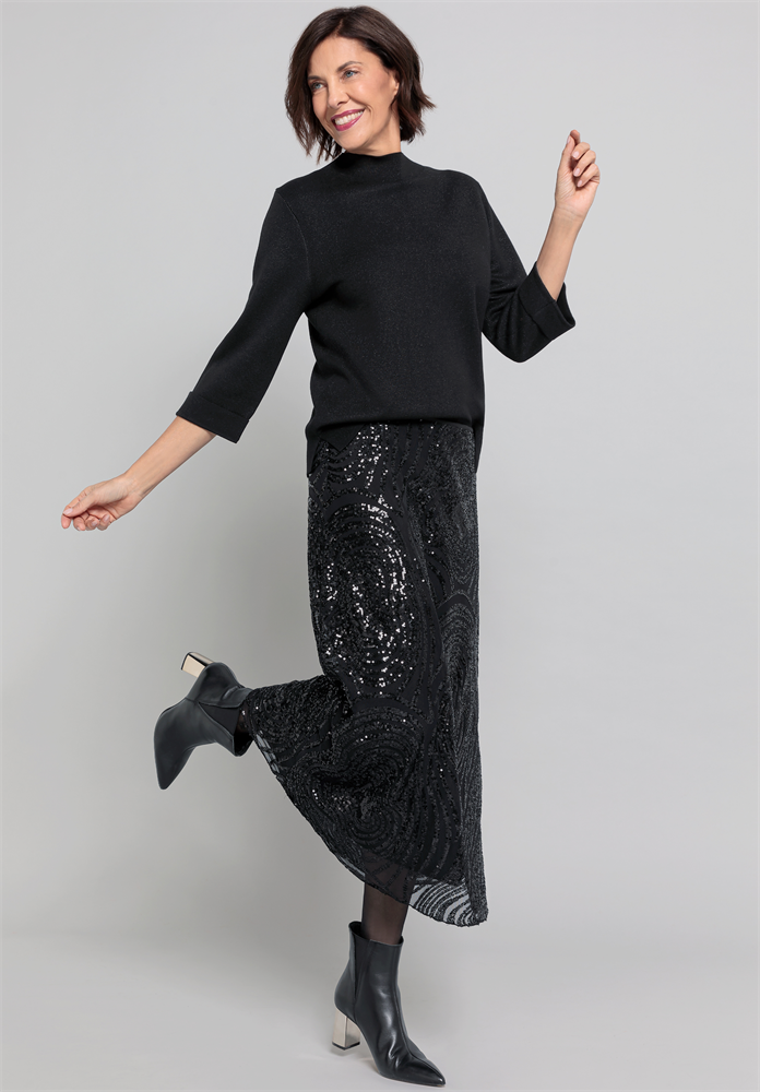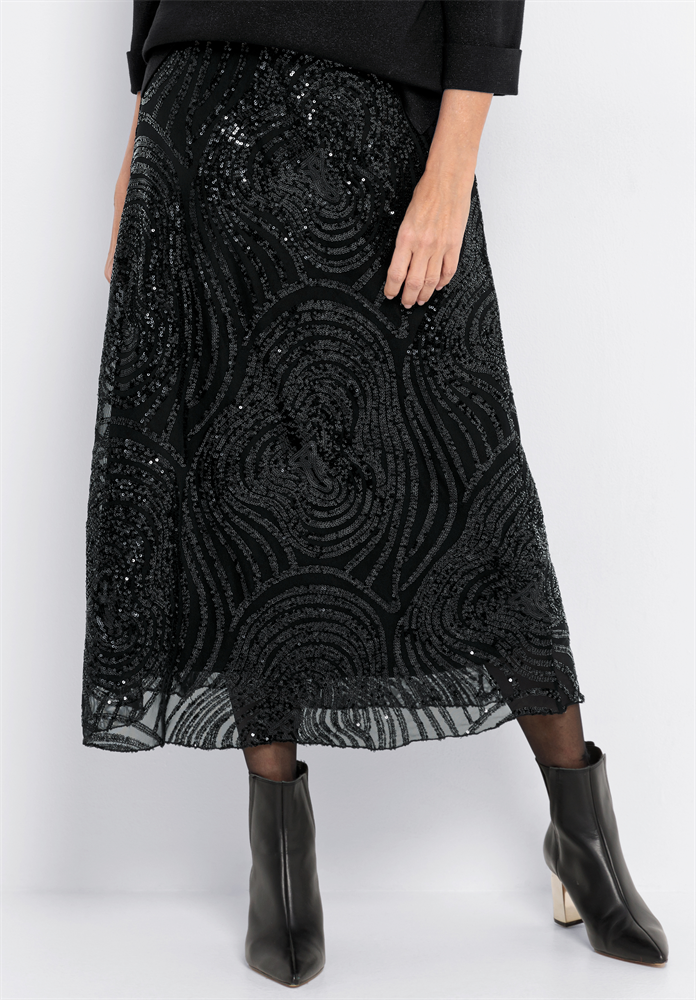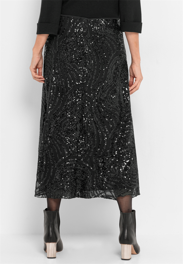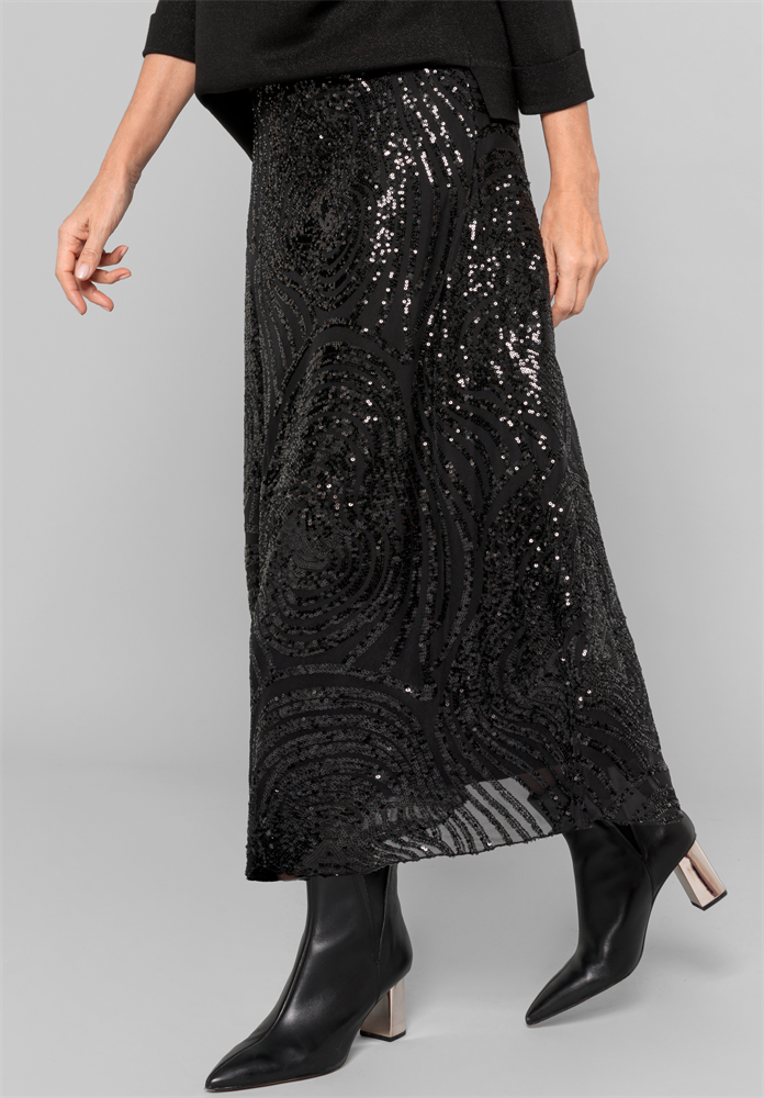 Glanzvoll auftreten mit Feli! Unser neuer exklusiver Paillettenrock überzeugt mit seiner modernen Maxi-Länge, der leicht ausgestellten Form und dem komfortablen Gummibund. Hochwertiges Mesh mit Elasthan und ein weiches Jerseyfutter sorgen für angenehmen Tragekomfort. Ein Rock, der Eleganz und Leichtigkeit vereint, und Sie bei jedem Anlass strahlen lässt.