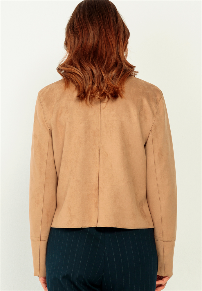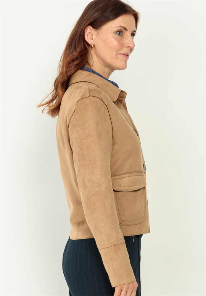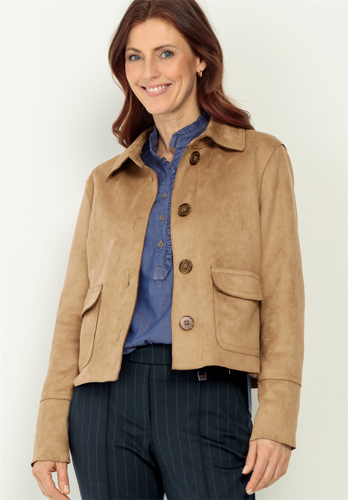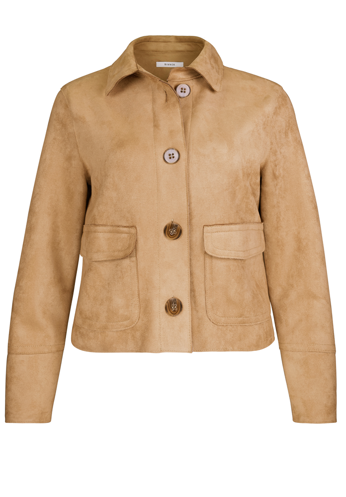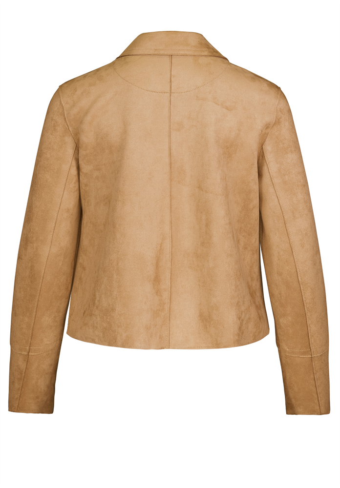 * Trendige Lederimitatjacke mit Knopfleiste * Hochwertiger Materialmix für ein angenehmes Tragegefühl * Aus Velourslederimitat, mit aufgesetzten Taschen und Patten * Kurzer Schnitt, gerade Passform mit langem Arm * Bei Gr. 38: Länge ca. 52cm, ab Gr.40 je Gr. ca. 1cm länger