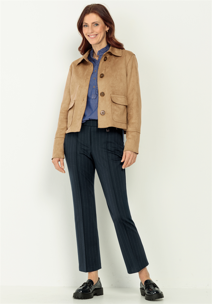 Unsere moderne Kurzjacke Katherin aus weichem Velourslederimitat überzeugt durch die gerade Passform und zeitlosen Stil. Das hochwertige Material fühlt sich angenehm auf der Haut an und verleiht jedem Outfit eine stilvolle Note, der Hemdblusenkragen und die aufgesetzten Taschen mit Patten runden den coolen Look gekonnt ab. Perfekt für den Alltag oder besondere Anlässe lässt sich der Blazer vielseitig kombinieren - ob zu Bluse und Hose oder lässig zu T-Shirt und Jeans.