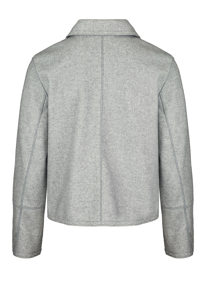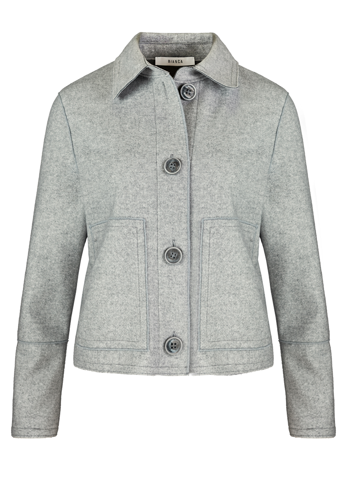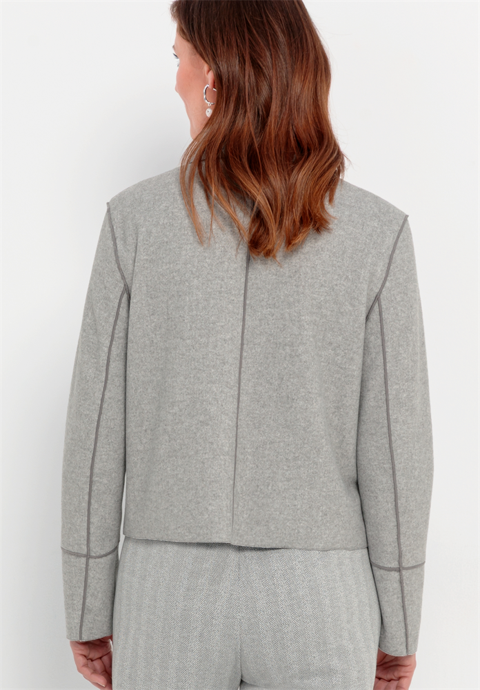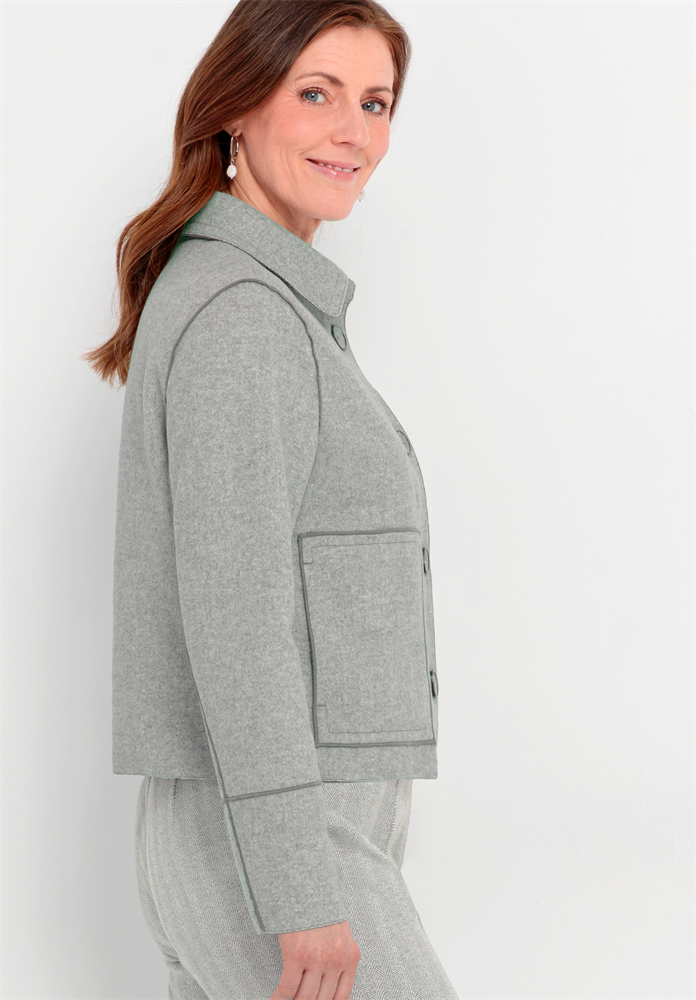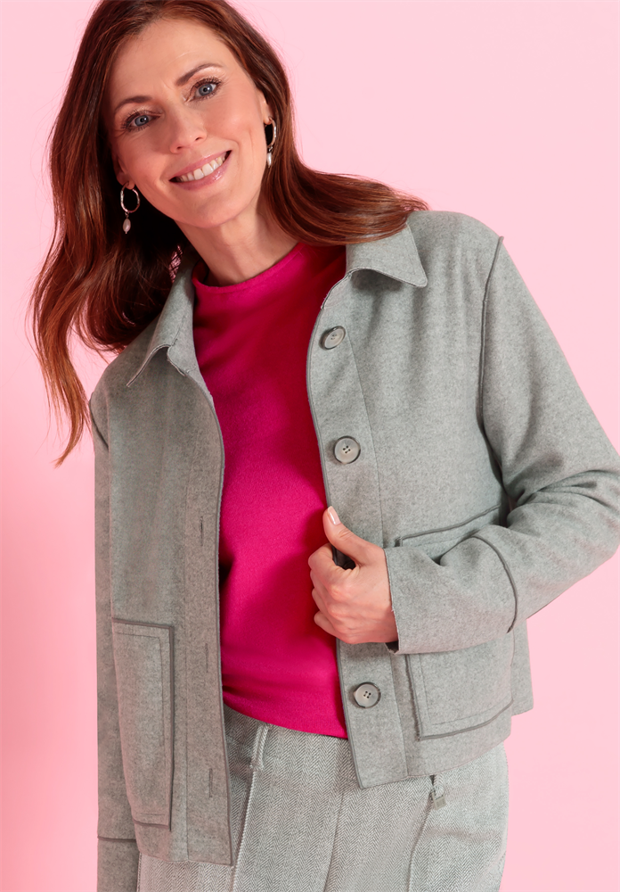 * Lässige Kurzjacke mit Umlegekragen * Hochwertiger Materialmix in Jerseyqualität * Mit Knopfleiste und aufgesetzten Taschen * Kurze, gerade Passform, ungefüttert * Bei Gr. 38: Länge ca. 52cm, ab Gr.40 je Gr. ca. 1cm länger