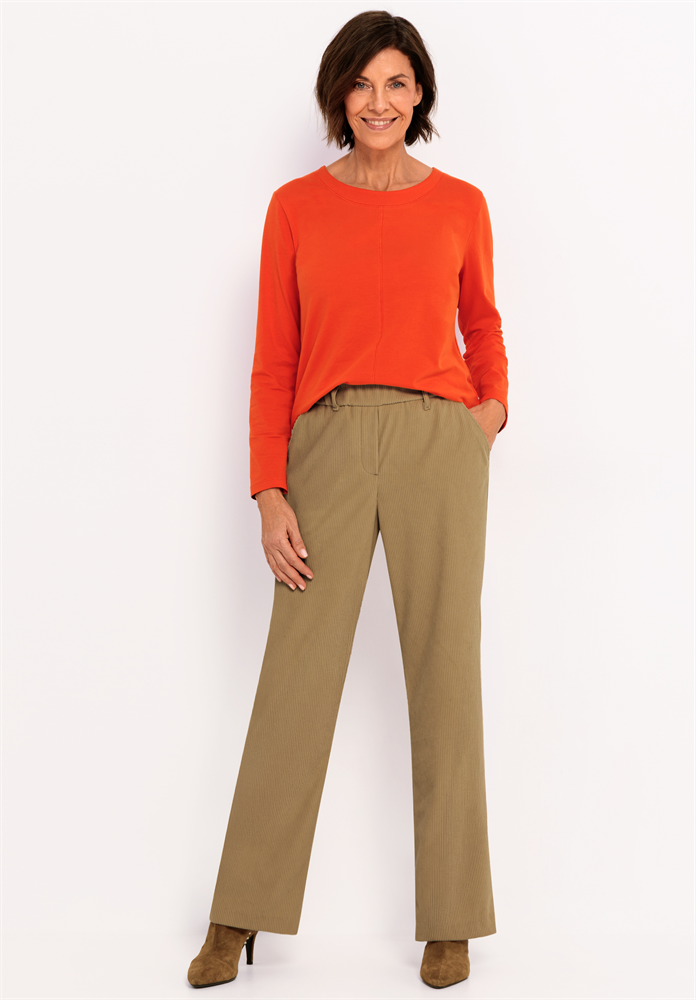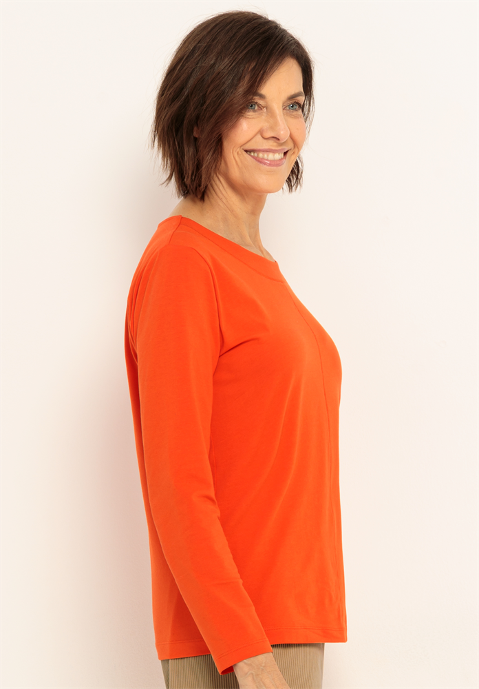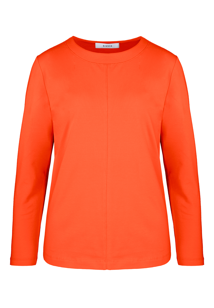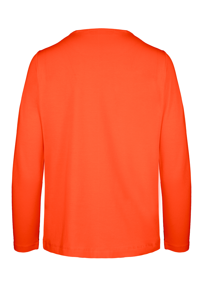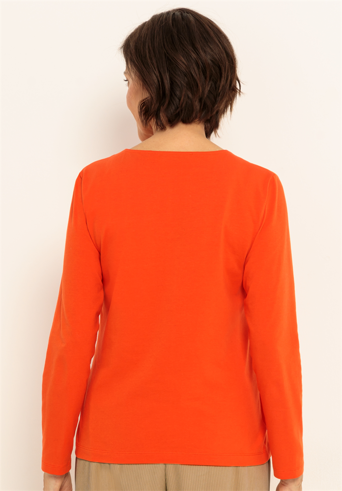 * Schönes Rundhalsshirt mit Blende am Ausschnitt * Weiche Baumwollqualität mit Elasthan, Formstabil * Mit Langarm * Gerader Schnitt, schmale Passform * Bei Gr. 38: Länge ca. 64 cm