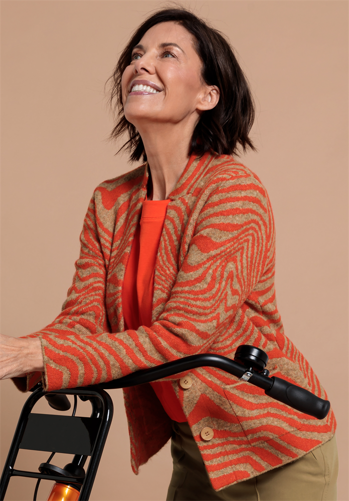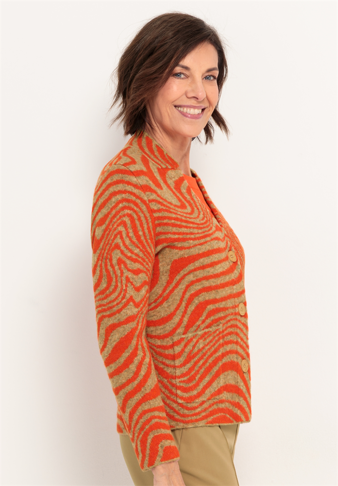 Perfekt zum Überziehen! Unsere neue Strickjacke Kosmos überzeugt mit ihrer kuscheligen Strick-Optik in moderner Animal-Print Optik in Trendfarben. Der hochwertige Materialmix mit Wolle fühlt sich sehr soft an und trägt sich angenehm auf der Haut. Der moderne Ausschnitt mit dem dezent anliegenden Stehkragen, dem 3-Knopf-Verschluss, dem Langarm und den aufgesetzten Taschen vorne runden den lässigen Look ab. Damit ist Kosmos der perfekte Begleiter um viele Outfits zu komplettieren, style sie sowohl zu femininen als auch zu lässigen Outfits!