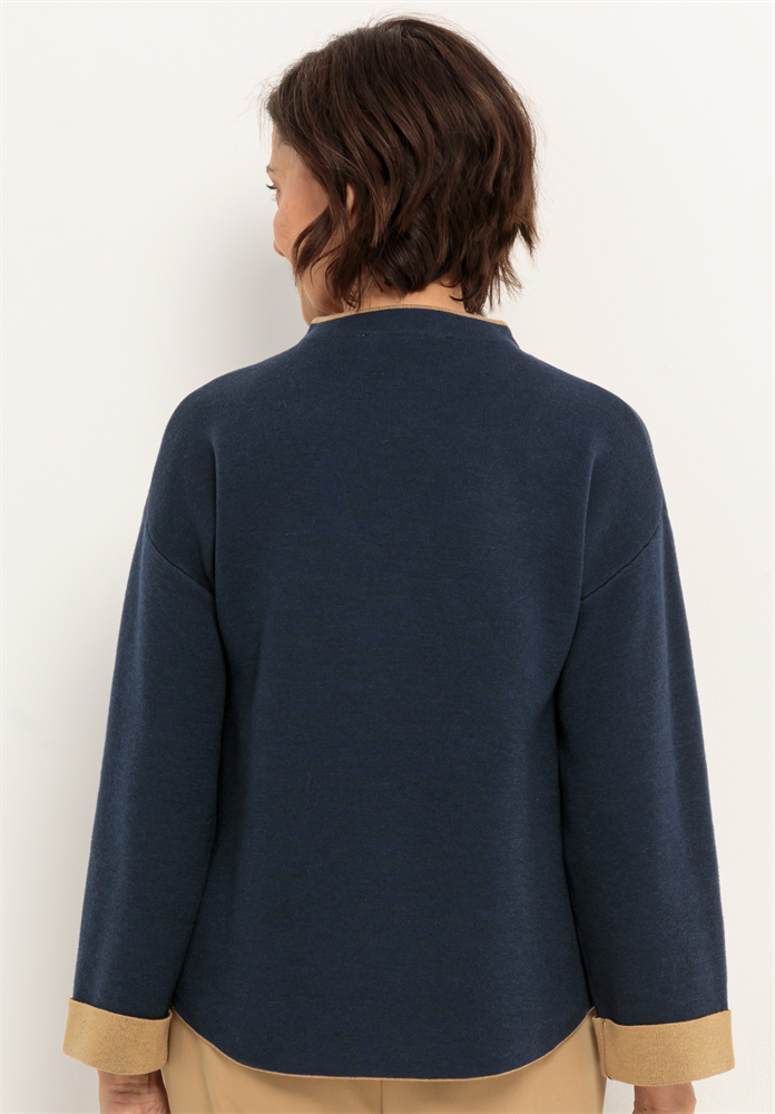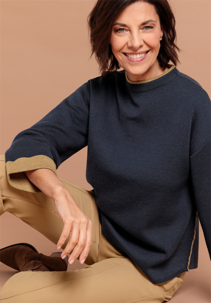 * Angesagter Strickpullover mit dezenten Kontrastdetails * Hochwertiger Materialmix mit kleinem Wollanteil * Etwas höher geschnittener Rundhalsausschnitt * Gerade, lockere Passform * Bei Gr. 38: Länge ca. 62cm