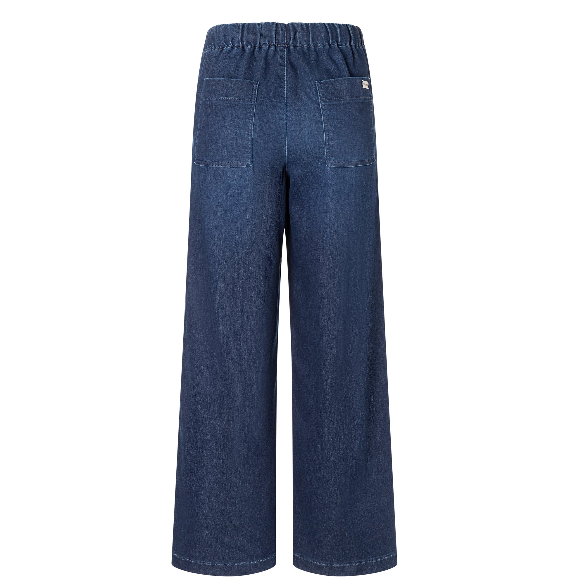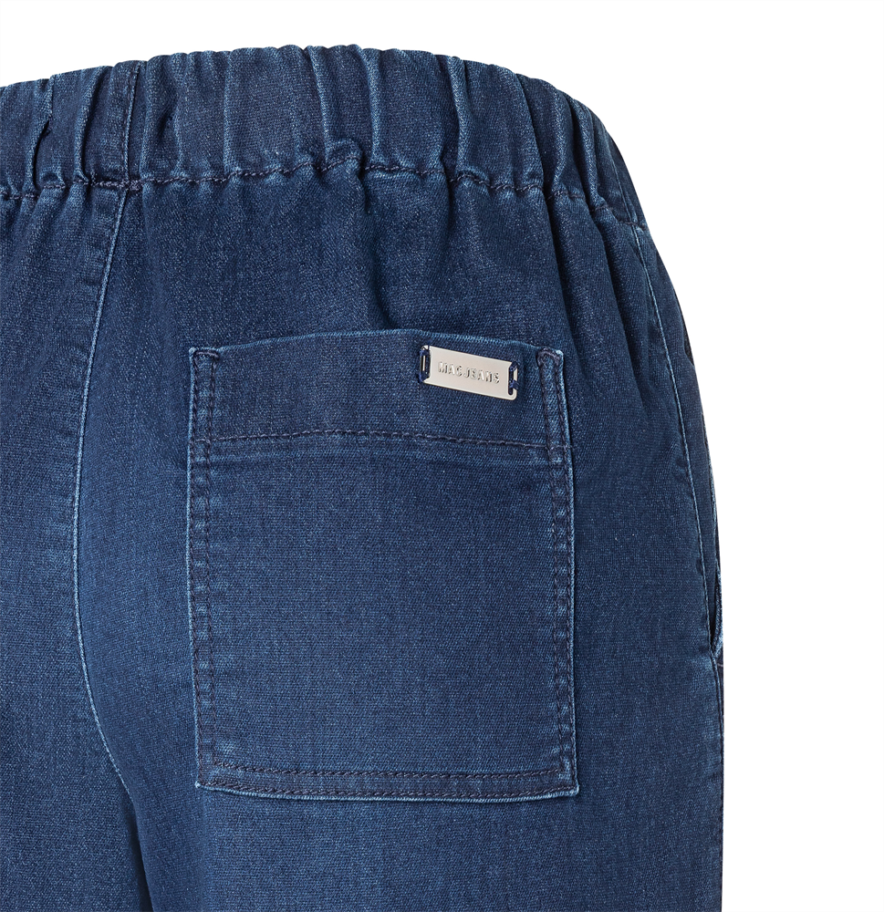 Wide Fit, Wide Leg, gerades, weites Bein, mittlere Leibhöhe, bequem an Gesäß und Oberschenkel, elastischer Bund mit Tunnelzug, seitliche Eingrifftaschen vorne, große, aufgesetzte Taschen hinten, Authentic Sweat Denim, elastische, fließende 9oz Sweat Denim-Qualität, angenehm weicher Griff, hoher Tragekomfort, authentische Jeans-Optik, hohe Formstabilität ohne Ausbeulen, leicht im Gewicht, Das Model ist 1,75m groß und trägt die MAC Hosengröße 36, Fußweite in Größe 36: 58cm
