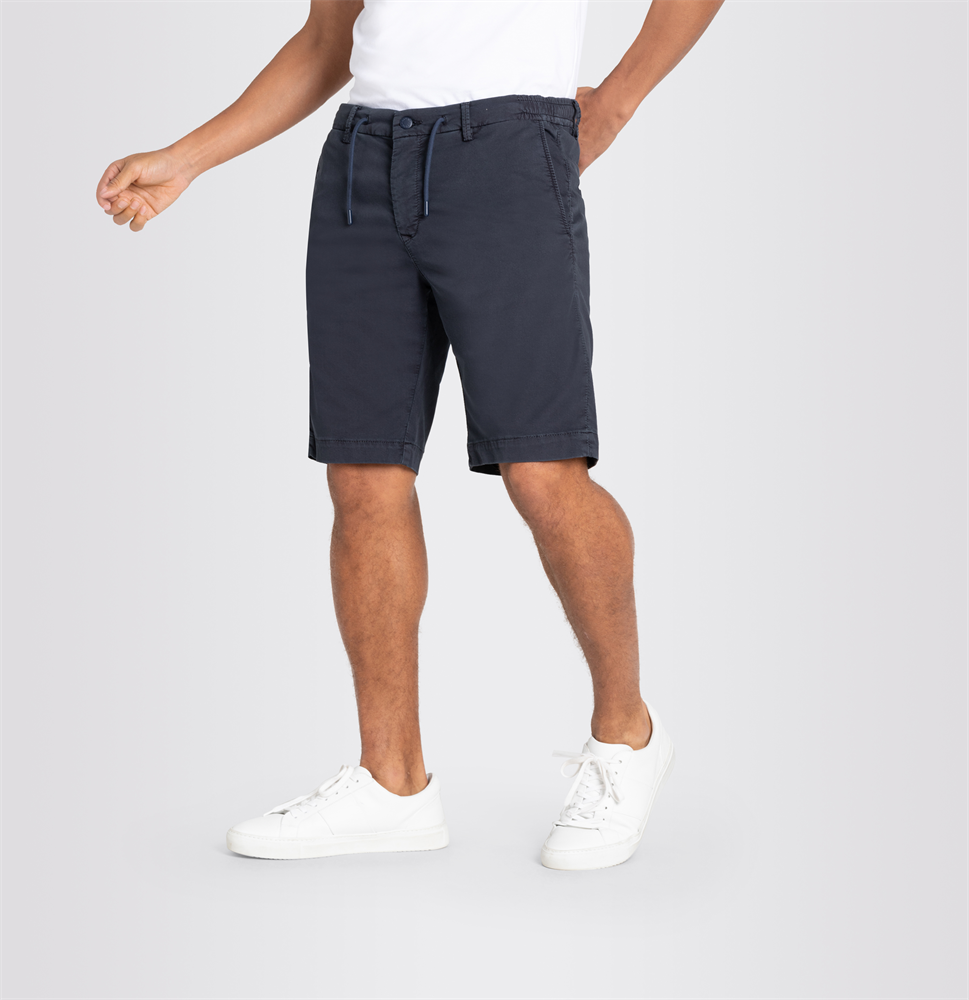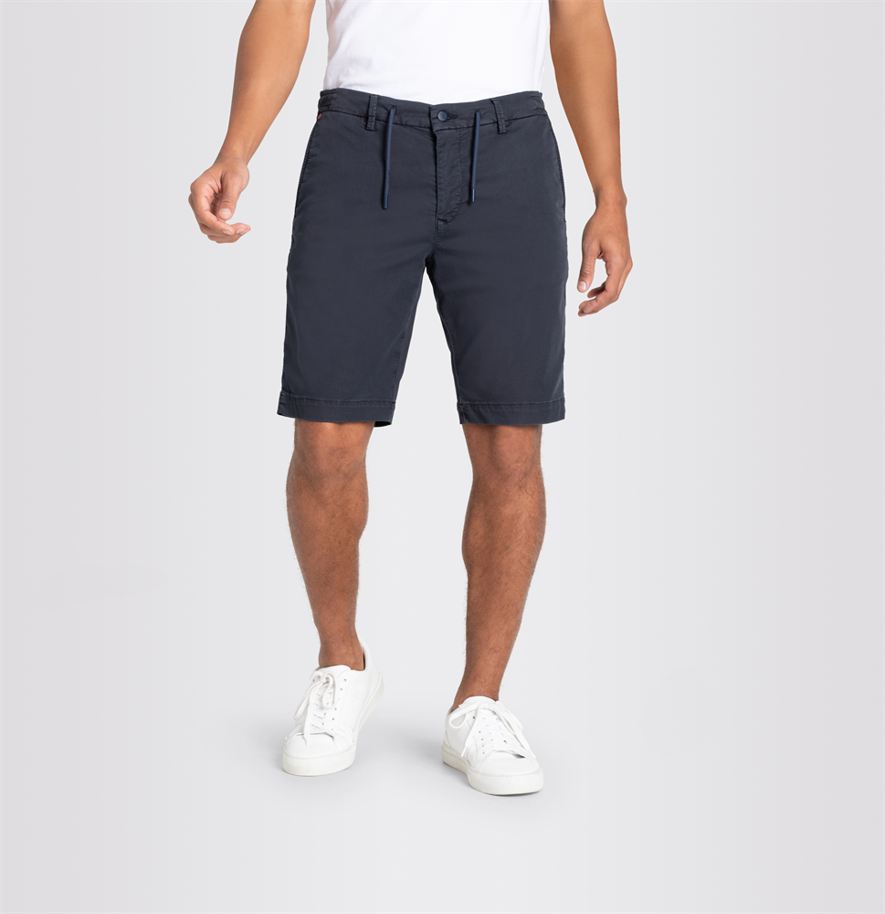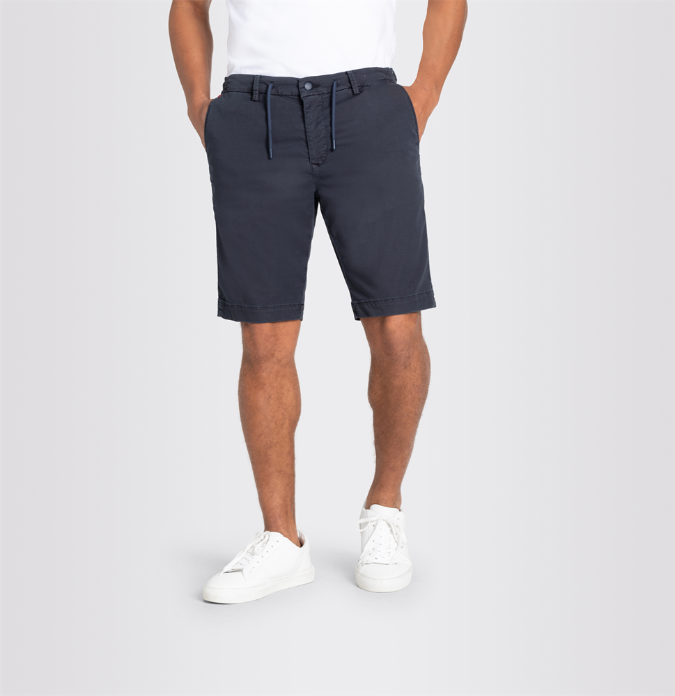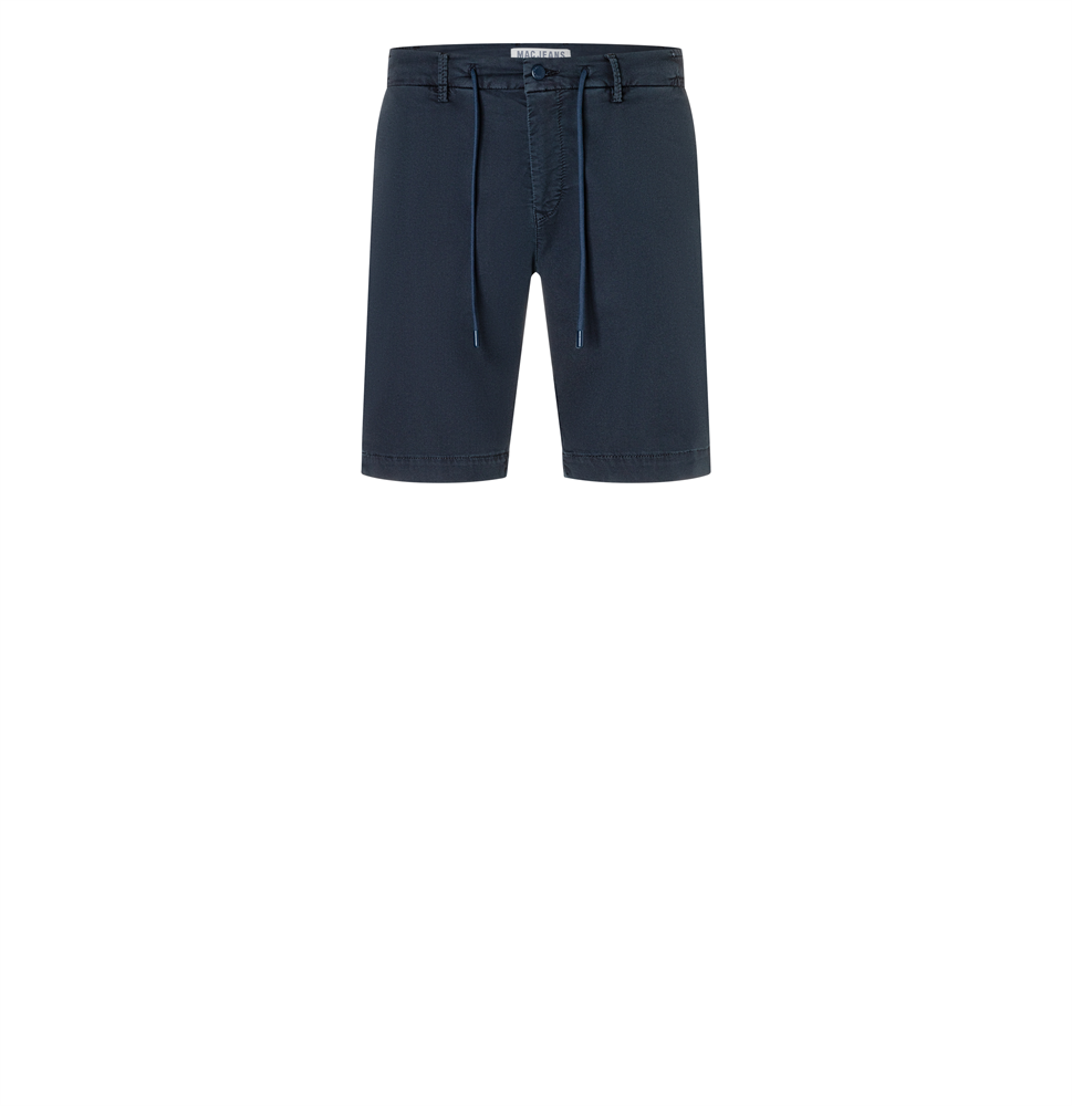 Bermuda im Chino Design schlanke Passform bequeme Leibhöhe Tunnelzug innen oder außen einsetzbar seitliche Eingrifftaschen Paspeltaschen mit Knopf hinten hochwertiger Sweat Denim hoher Tragekomfort formstabile Qualität authentische Colour Denim-Optik weich im Griff Materialmix mit Recycled Polyester über Better Cotton gesourcte Baumwolle Das Model ist 1,85m groß und trägt die MAC Bundweite 33 Beinabschluss bei Größe 33: 50cm
