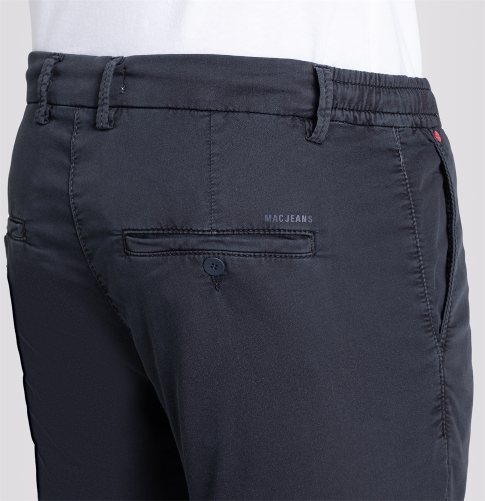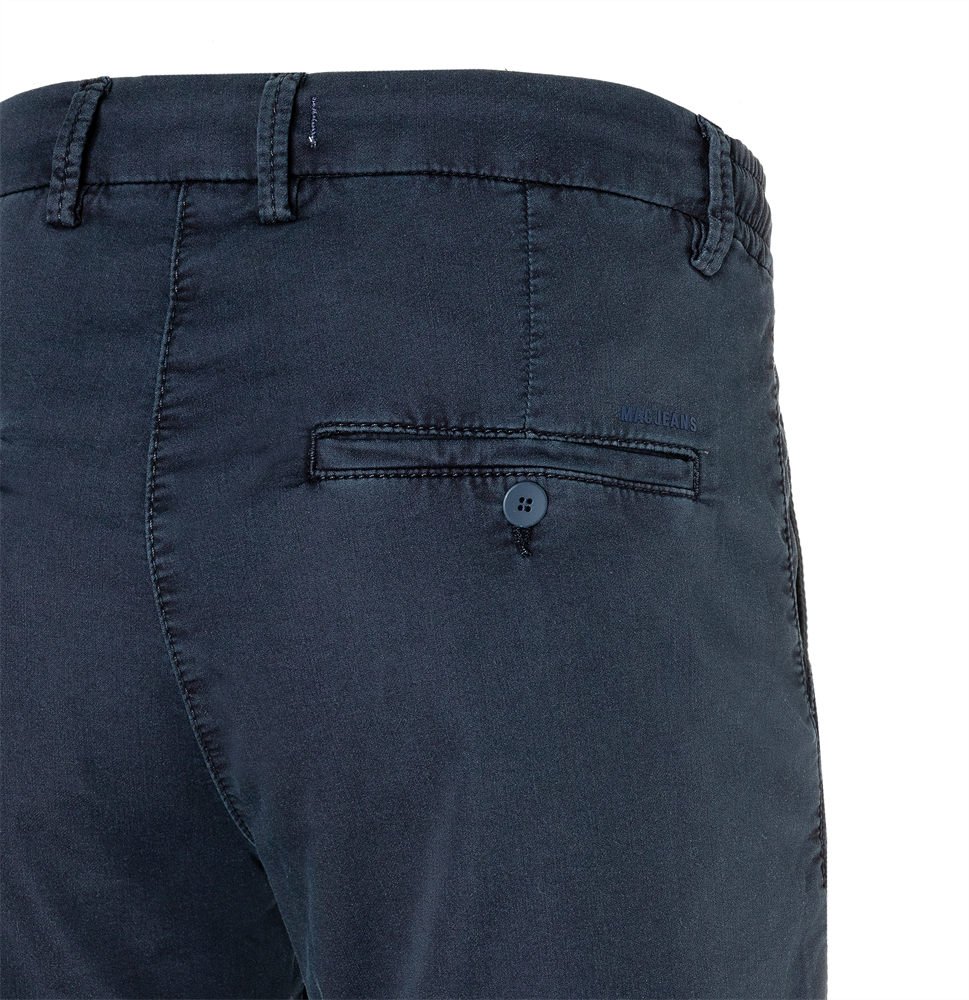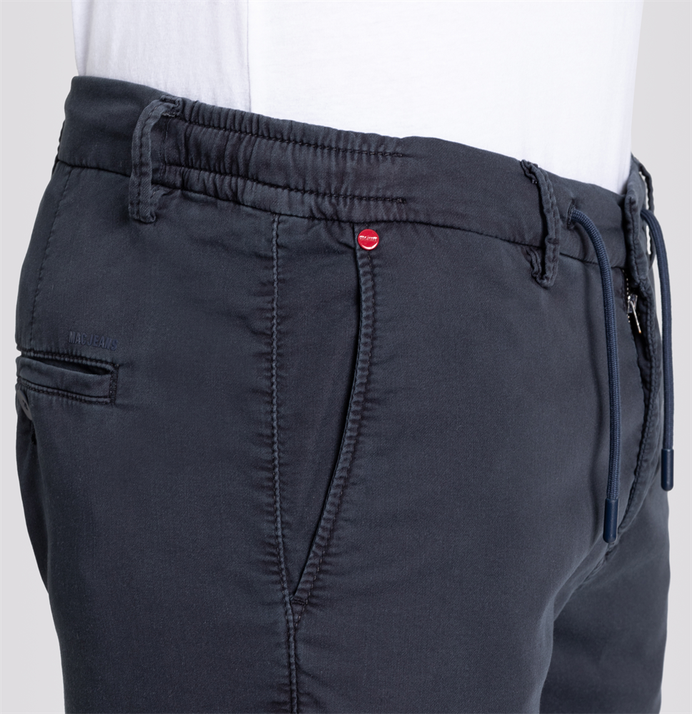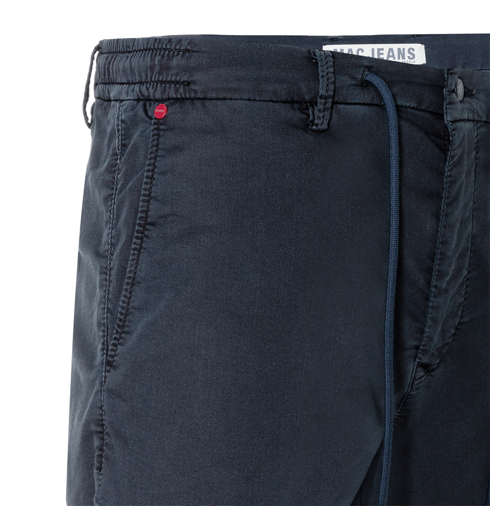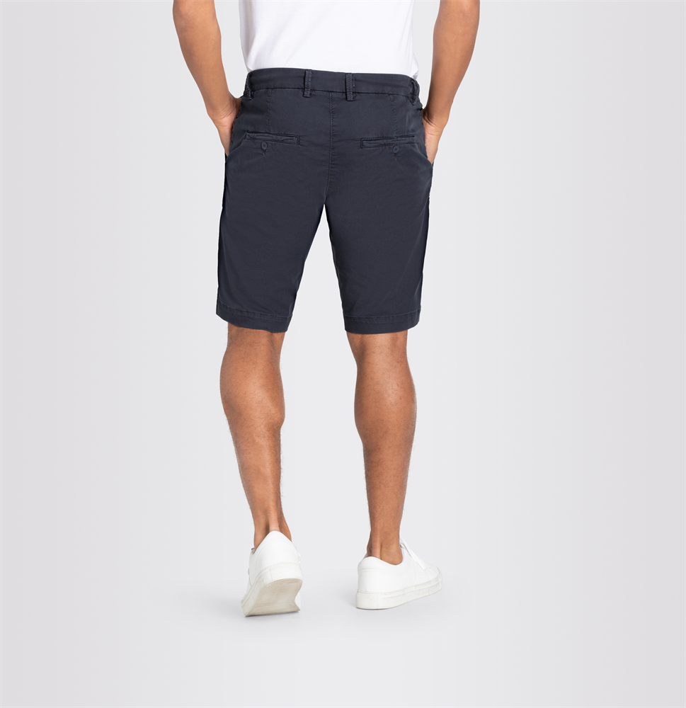 Bermuda im Chino Design schlanke Passform bequeme Leibhöhe Tunnelzug innen oder außen einsetzbar seitliche Eingrifftaschen Paspeltaschen mit Knopf hinten hochwertiger Sweat Denim hoher Tragekomfort formstabile Qualität authentische Colour Denim-Optik weich im Griff Materialmix mit Recycled Polyester über Better Cotton gesourcte Baumwolle Das Model ist 1,85m groß und trägt die MAC Bundweite 33 Beinabschluss bei Größe 33: 50cm