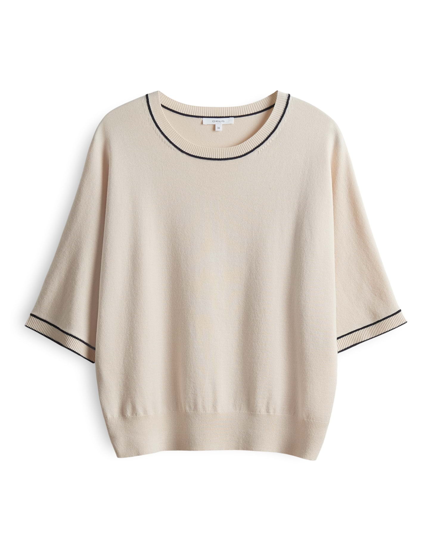 lockere Passform, O-Form, leicht verkürzt geschnitten, kurzer Fledermausärmel, Rundhalsausschnitt, Rückenlänge ca. 54 cm bei Größe 36, Model Größe 178 cm ? trägt Größe 36, Feinstrick, weicher Griff, gerippter Saum, kontrastreiche Nähte