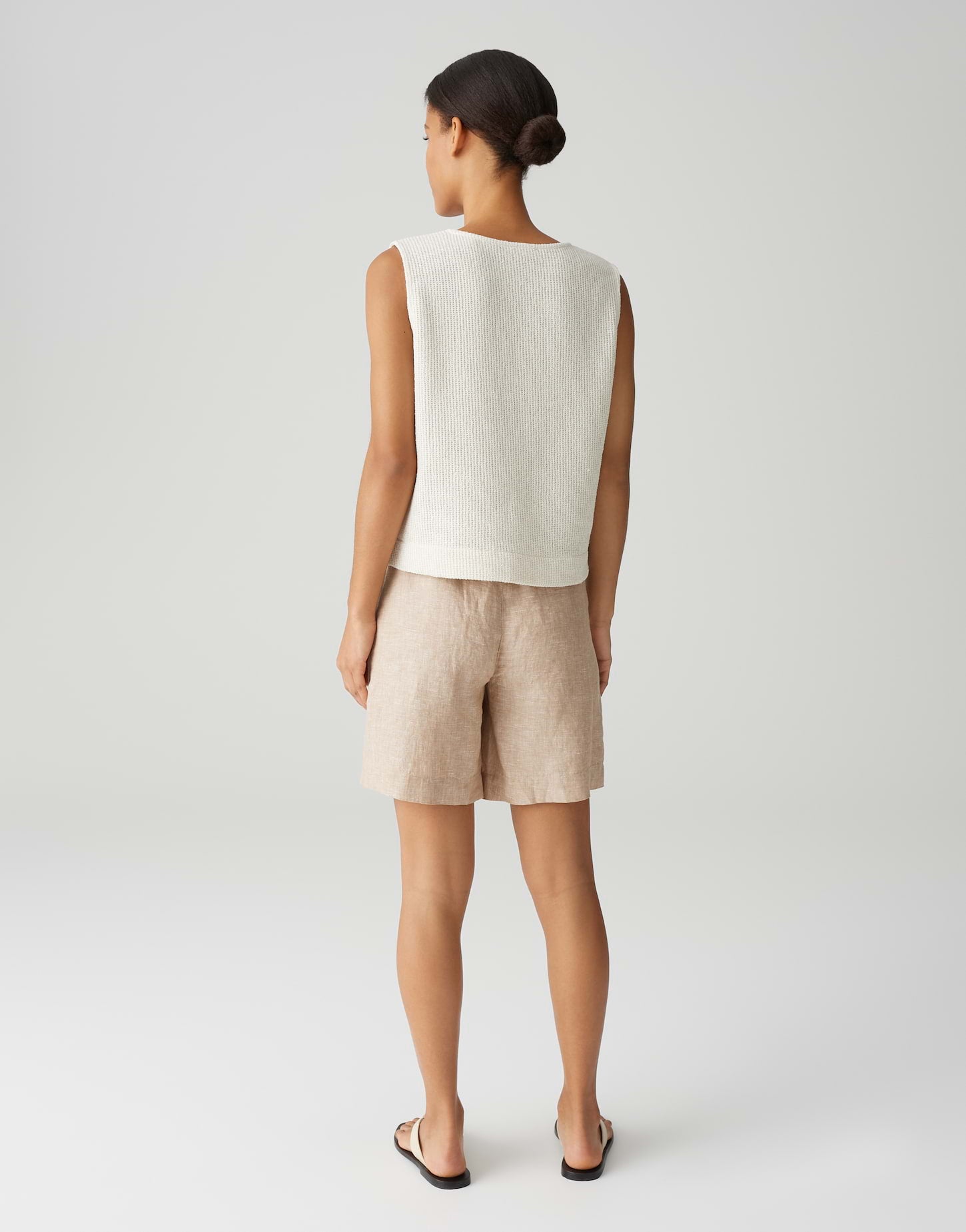 lockere Passform, Boxy Silhouette, verkürzte Länge, Nullarm, V-Ausschnitt, Rückenlänge ca. 54 cm bei Größe 36, Model Größe 175 cm ? trägt Größe 36, Sweatware, feine Rippstruktur, natürlicher Griff, leicht elastischer Stoff, fließender Fall, offene Teilungsnaht vorn, mit kleinen Riegeln verschlossen