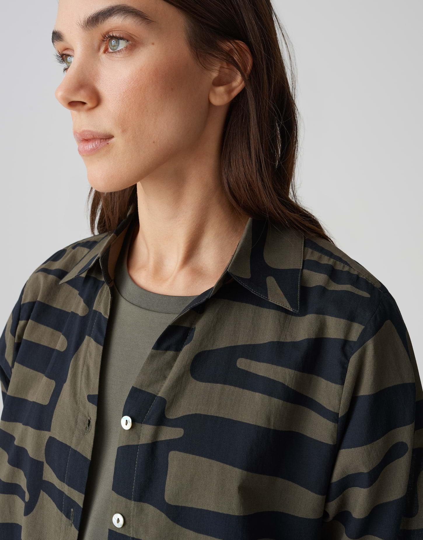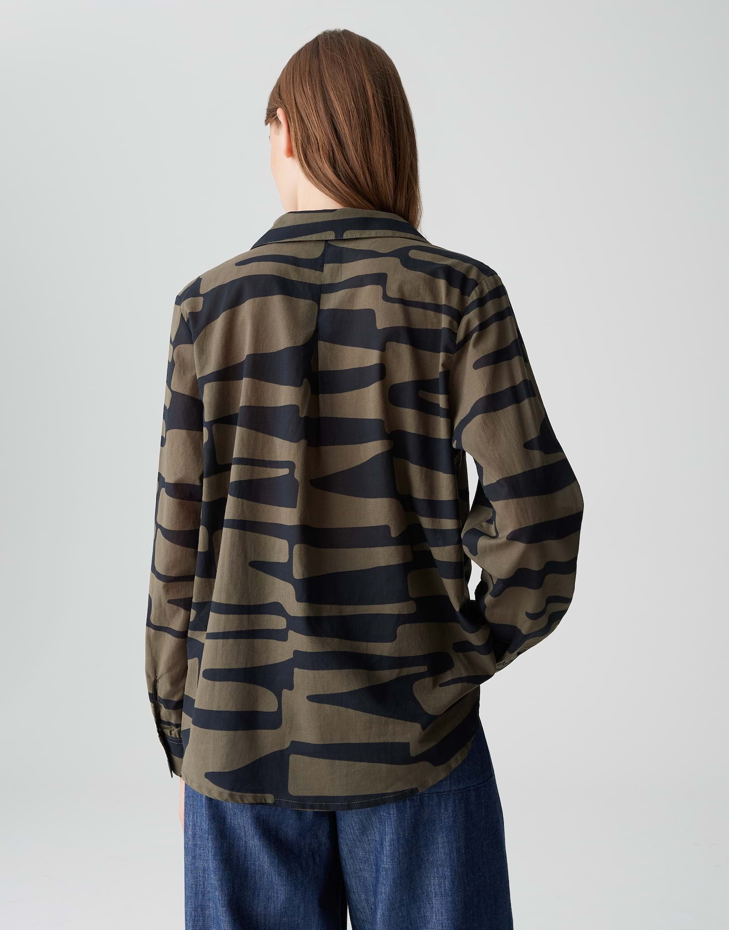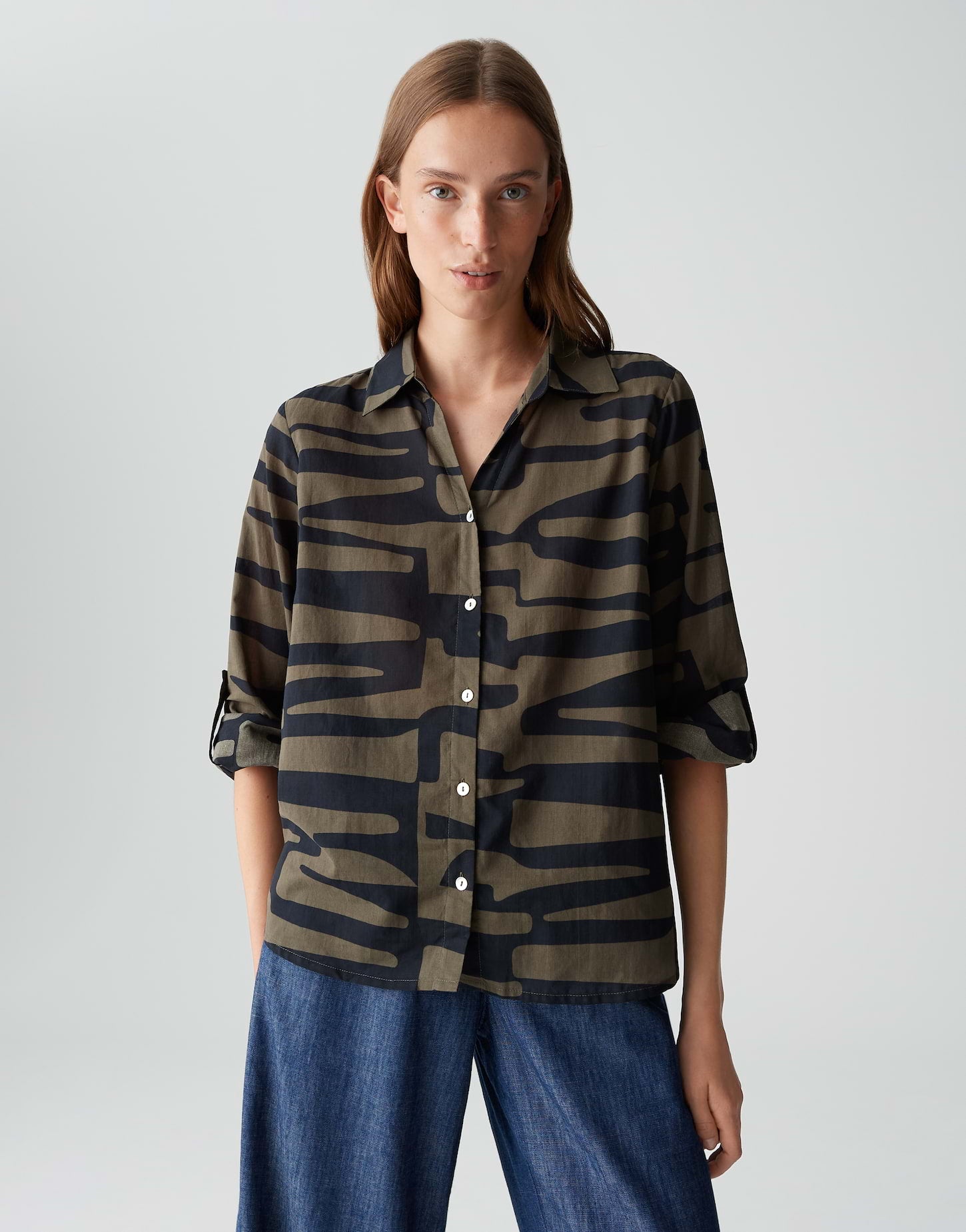 weite Passform, leicht ausgestellt geschnitten, hinten länger als vorne, Langarm, V-Ausschnitt, Hemdblusenkragen, Rückenlänge ca. 68 cm bei Größe 36, Model Größe 175 cm ? trägt Größe 36, Webware, enthält nichttextile Teile tierischen Ursprungs, leichter Stoff, leichte Transparenz, atmungsaktiv, luftdurchlässig, All-Over-Print, Kellerfalte im Rücken, lange Knopfleiste, Perlmuttknöpfe, Aufschlag mit Riegel am Ärmel, klassische Manschetten
