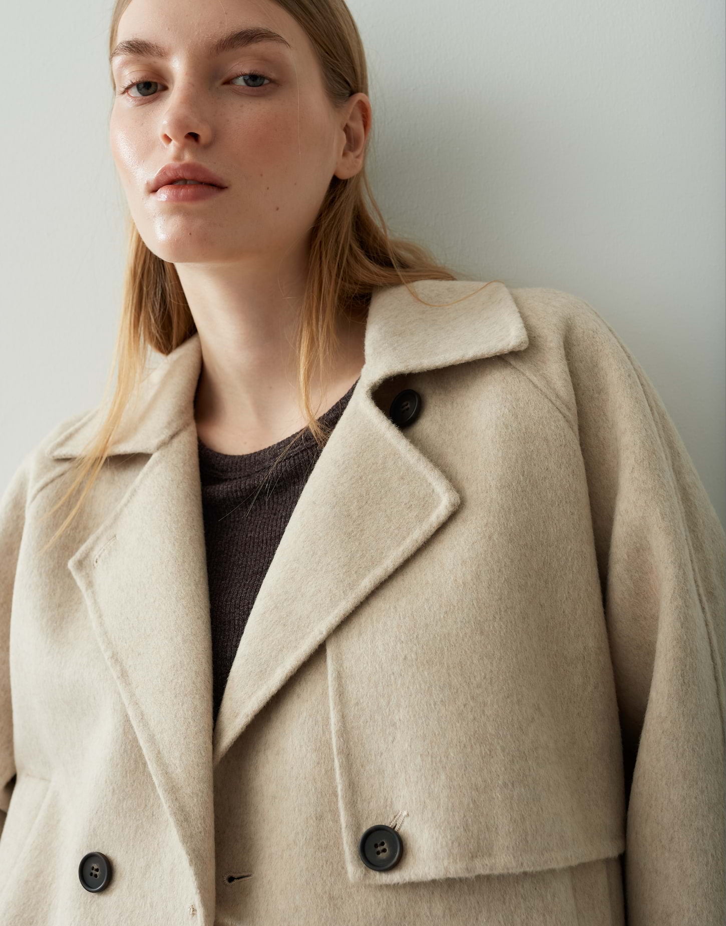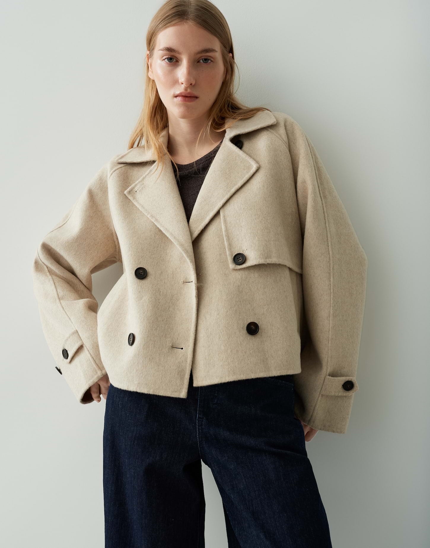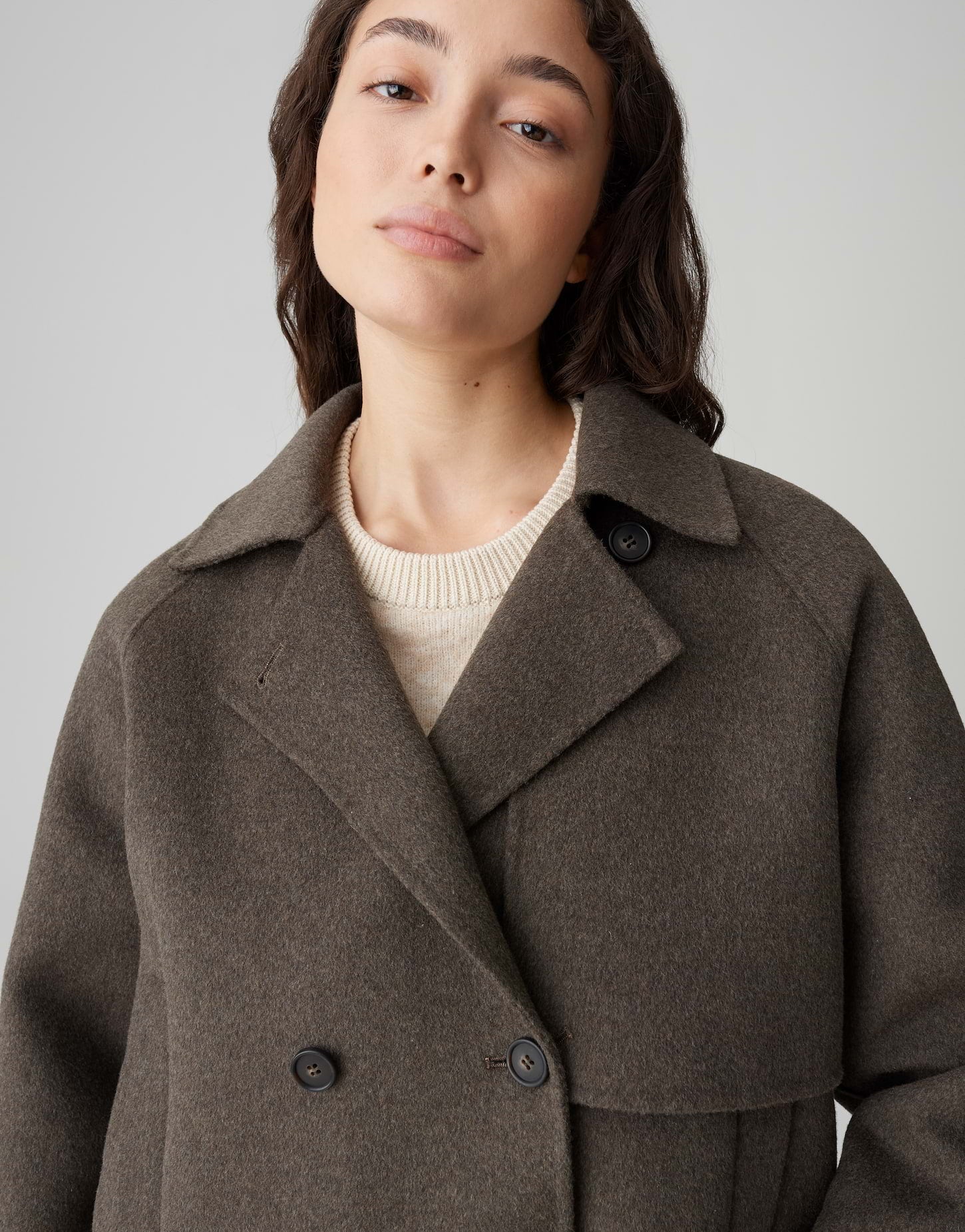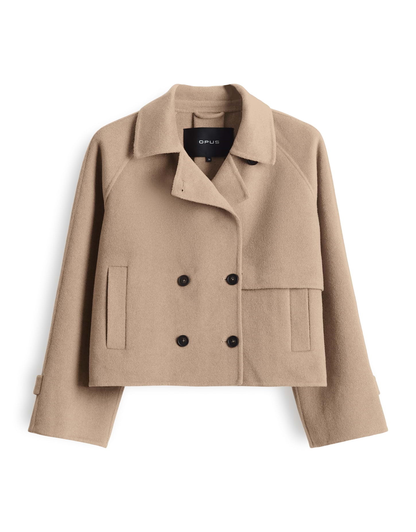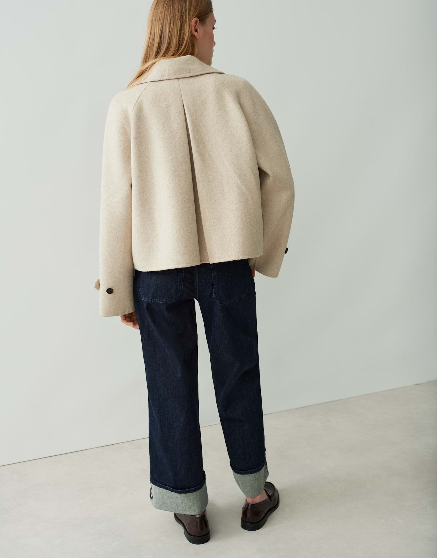 lockere Passform, leicht ausgestellt geschnitten, verkürzte Länge, Langarm, Reverskragen, Rückenlänge ca. 56 cm bei Größe 36, Model Größe 172 cm ? trägt Größe 36, Webware, ungefüttert, weicher Griff, wärmender Stoff, Paspeltaschen vorne, Kellerfalte, zweireihige Knopfleiste, Raglanärmel, Riegel an der Manschette, Knöpfe in Horn Optik