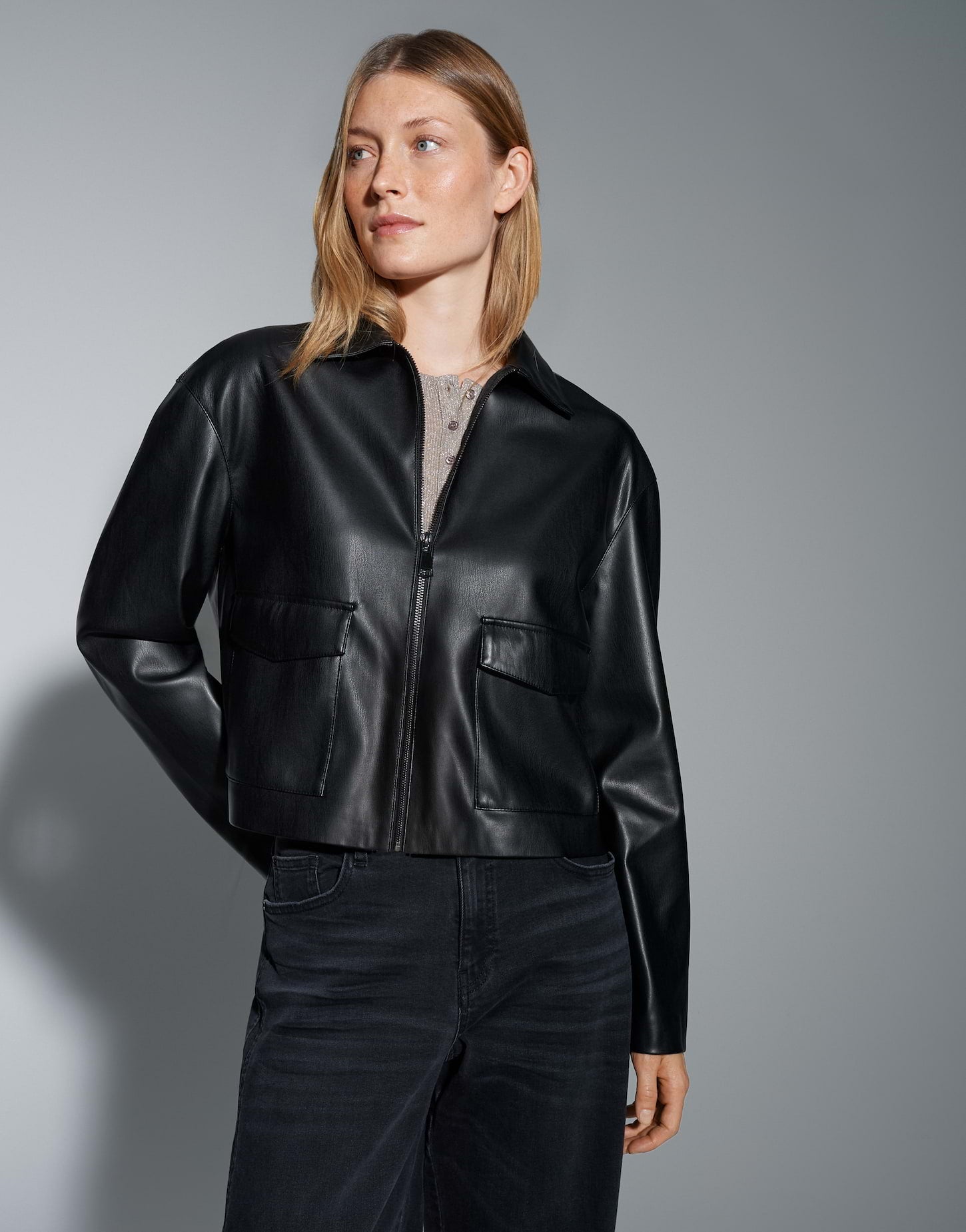 lockere Passform, gerader Schnitt, leicht verkürzt geschnitten, Langarm, Umlegekragen, Rückenlänge ca. 53 cm bei Größe 36, Model Größe 174 cm ? trägt Größe 36, weicher Griff, Lederimitat, ungefüttert, dezente Struktur, matter Glanz in der Oberfläche