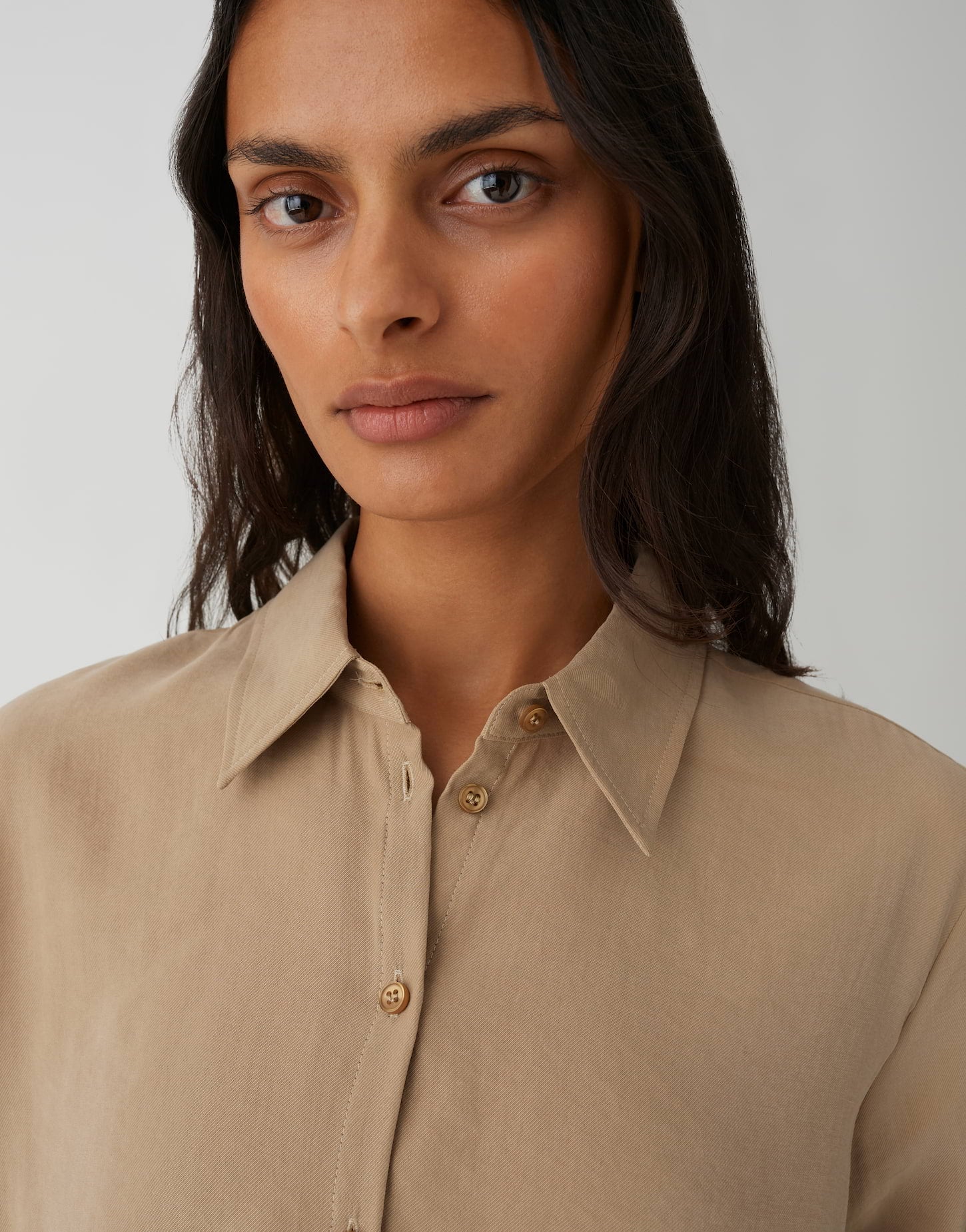 lockere Passform, ausgestellter Schnitt, leicht verkürzter Schnitt, Langarm, Hemdblusenkragen, Rückenlänge ca. 57 cm bei Größe 36, Model Größe 178 cm ? trägt Größe 36, Webware, dezente Twillstruktur, weicher Griff, samtige Oberfläche, fließender Fall, leichte Transparenz im hellen Farbton, Kellerfalte im Rücken, Knopfleiste
