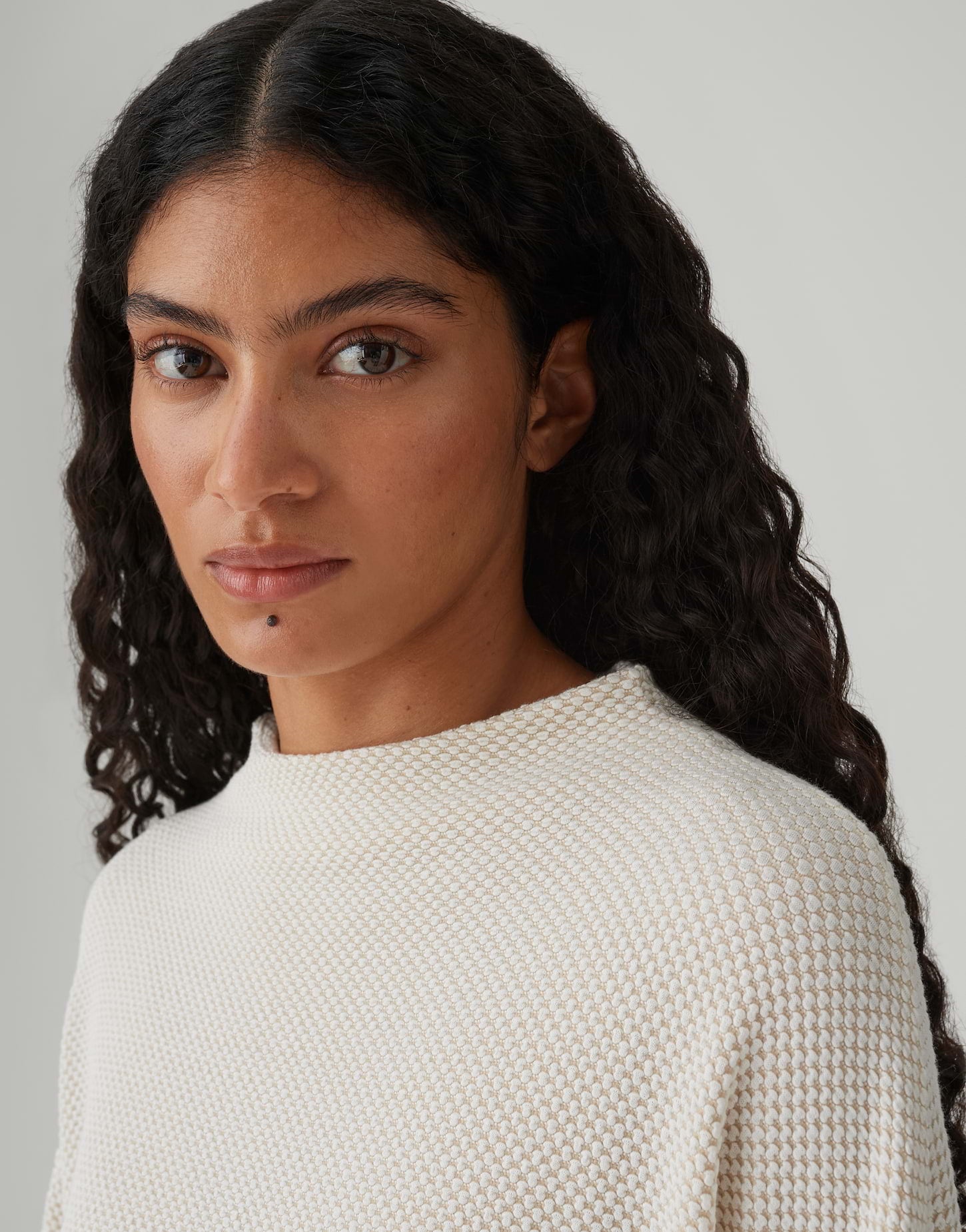 lockere Passform, schmal zulaufender Schnittt, überschnittene Schulter mit Langarm, Funnel Neck, Rückenlänge ca. 58 cm bei Größe 36, Model Größe 176 cm ? trägt Größe 36, Jersey, 3-dimensionale Struktur, weicher Griff, elastisch, zweifarbiges Muster