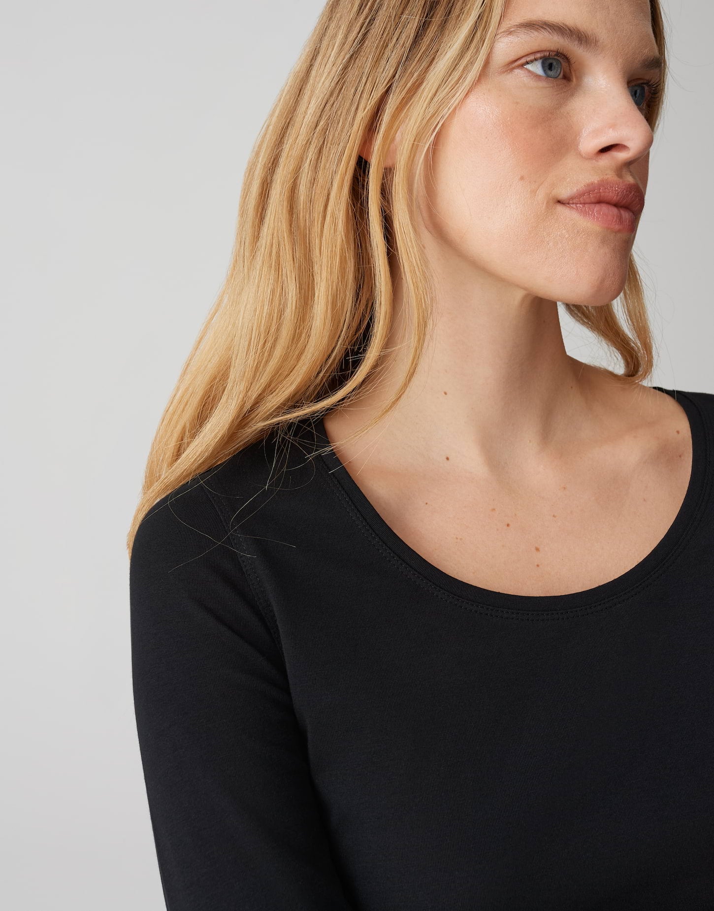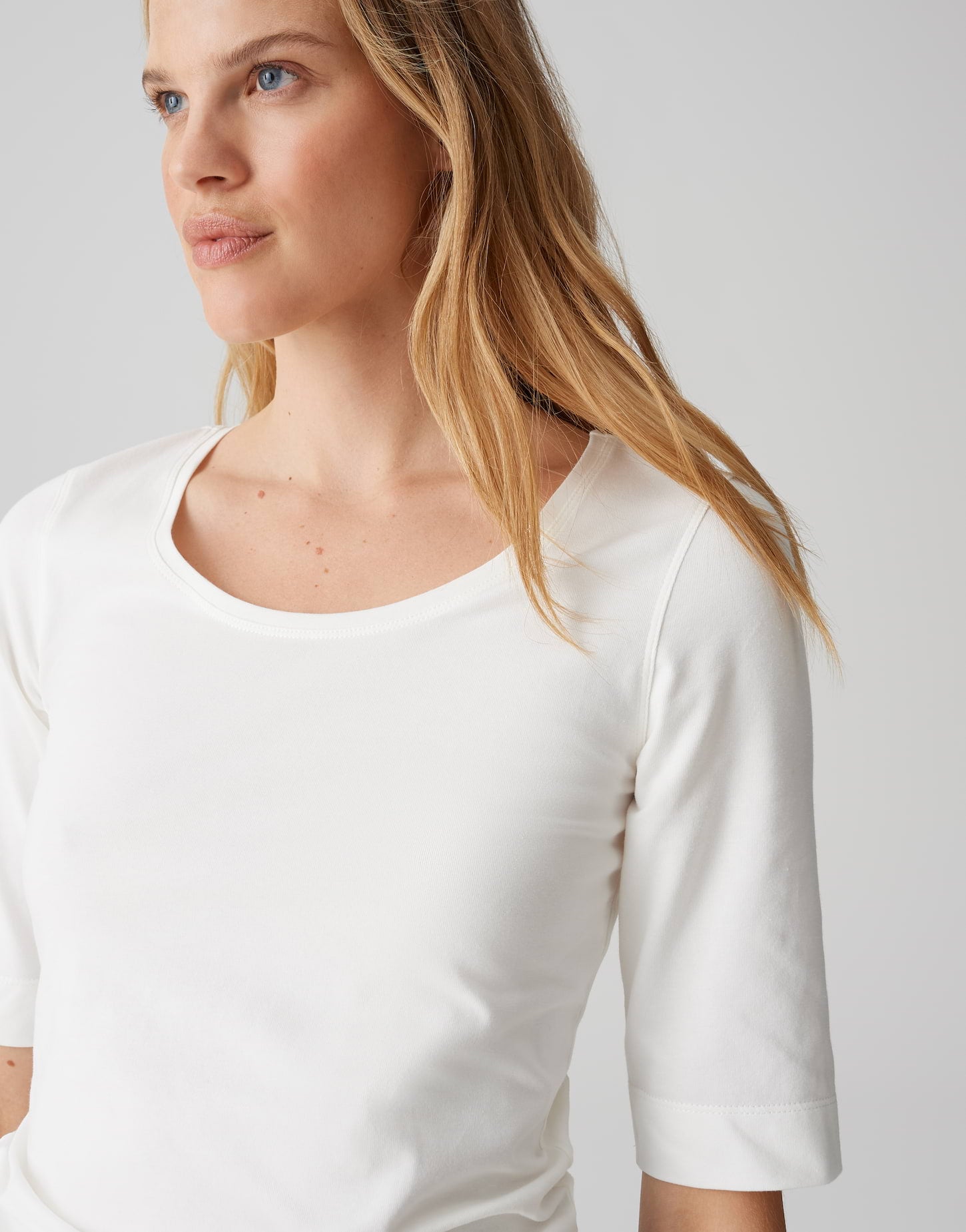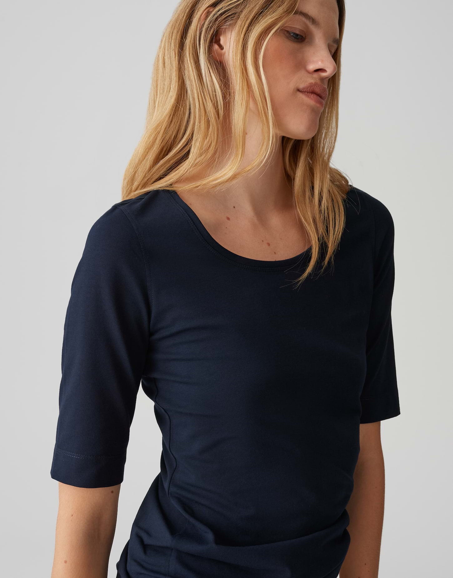 schmale Passform, verlängerter Kurzarm, Rundhalsauschnitt, Rückenlänge ca. 62 cm bei Größe 36, Model Größe 179 cm ? trägt Größe 36, BCI Cotton Mix, weicher Griff, elastischer Stoff