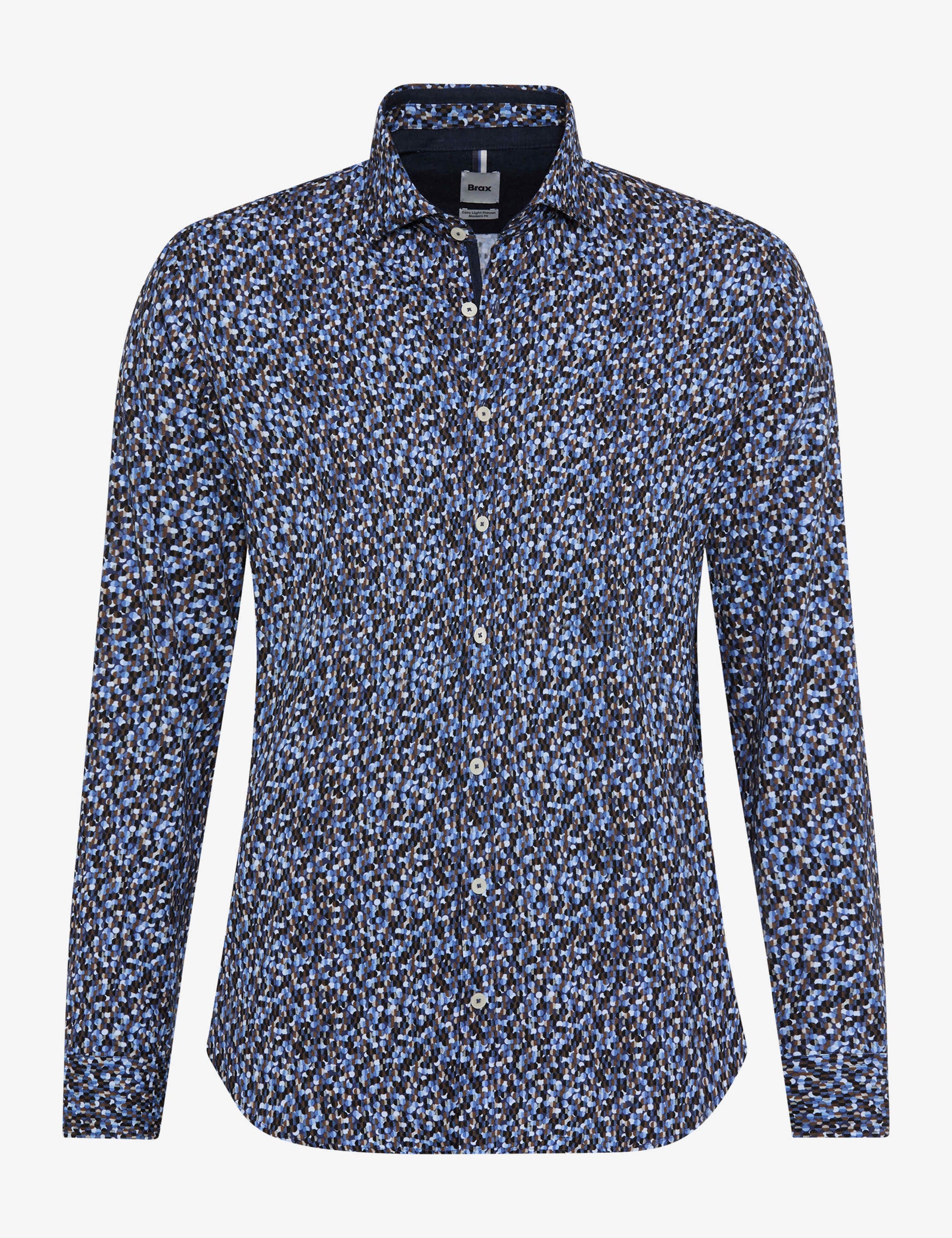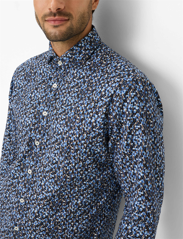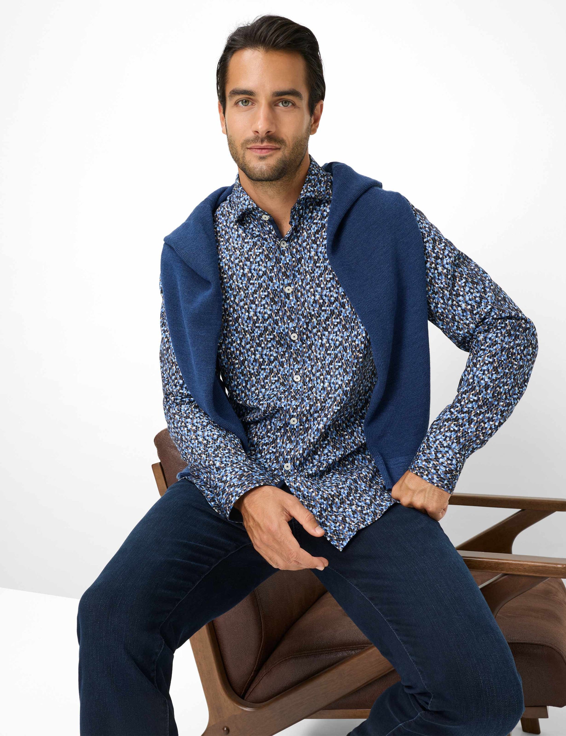 Mit seinem modernen Allover-Dessin und dem markanten Farbspiel in Blaunuancen gelingt dem Hemd im Style HAROLD ein kraftvolles Statement für die kalte Jahreszeit. Die maskuline, leicht taillierte Silhouette und ein eleganter Haifischkragen sorgen für eine zeitgemäße Passform, die weder auf Komfort noch auf Stil verzichtet. Der geometrisch inspirierte Print verleiht dem Hemd eine ausdrucksstarke Optik und lässt sich vielseitig kombinieren. Dank der soften Flanellqualität überzeugt das Herrenhemd nicht nur optisch, sondern auch durch ein angenehmes Tragegefühl. Die gebürstete Baumwolle sorgt für ein hohes Maß an Komfort, ist atmungsaktiv und zugleich wärmend – ideal für Herbst und Winter. Die Materialwahl steht für natürliche Qualität und ist besonders hautfreundlich.