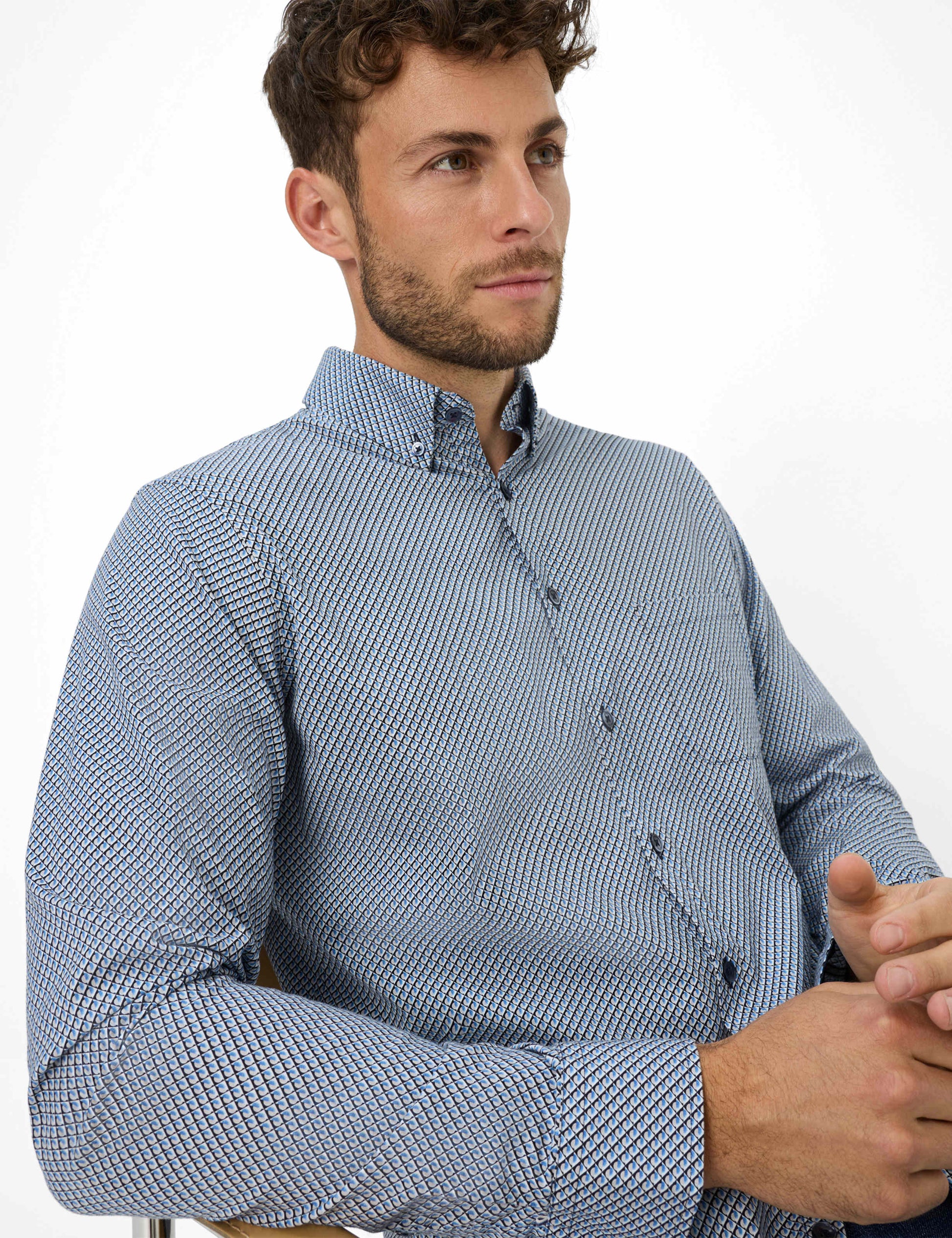 Ein stilbewusstes Update. Dieses klassische Herrenhemd im Style DANIEL überzeugt mit maskuliner Eleganz und hohem Tragekomfort. Die moderne, körpernahe Passform in Kombination mit einer taillierten Linienführung bringt die schlanke Silhouette präzise zur Geltung. Typische Merkmale wie der sportive Button-Down-Kragen, eine durchgehende Knopfleiste und die aufgesetzte Brusttasche unterstreichen die zeitlose Gestaltung. Das fein abgestimmte Minimalmuster in ansprechenden Farben bringt dezente Bewegung ins Design und verleiht dem Langarmhemd eine raffinierte Note – perfekt für Büro, Freizeit oder formelle Anlässe. Gefertigt aus geschmeidiger Popeline, bietet das Hemd eine glatte Oberfläche mit edlem Griff. Die innovative Hi-Flex-Qualität garantiert darüber hinaus angenehme Elastizität, die jede Bewegung mitmacht und den ganzen Tag über ein komfortables Tragegefühl sicherstellt. Der Baumwollmix verbindet atmungsaktive Eigenschaften mit dehnbarer Struktur – ideal für alle, die Wert auf Funkt