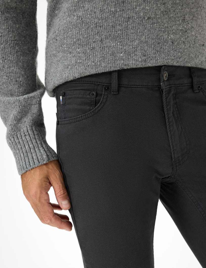 Ein vielseitiger Stil. Mit ihrer klaren Linienführung und dem maskulinen Charakter ist die Five-Pocket-Hose im Style CHUCK die perfekte Ergänzung für vielseitige Freizeit-Outfits. Die schlanke Silhouette im Modern Fit und mit normaler Leibhöhe sorgt für eine körpernahe Passform, die gleichzeitig angenehm zu tragen bleibt. Details wie aufgesetzte Gesäßtaschen, eine kleine Coinpocket und dezente Ziernieten unterstreichen die klassische Five-Pocket-Form. Durch die strukturierte Oberfläche erhält die Hose eine zusätzliche Tiefe, die dem Look eine dynamische Note verleiht. Gleichzeitig überzeugt der Baumwollmix mit einem weichen Griff und einem robusten, dennoch flexiblen Tragegefühl. Unterstützt wird der Komfort durch die elastische Hi-FLEX-Qualität, die jede Bewegung mühelos mitmacht. Diese Herrenhose ist ein echtes Essential – zeitgemäß, durchdacht und unkompliziert kombinierbar.