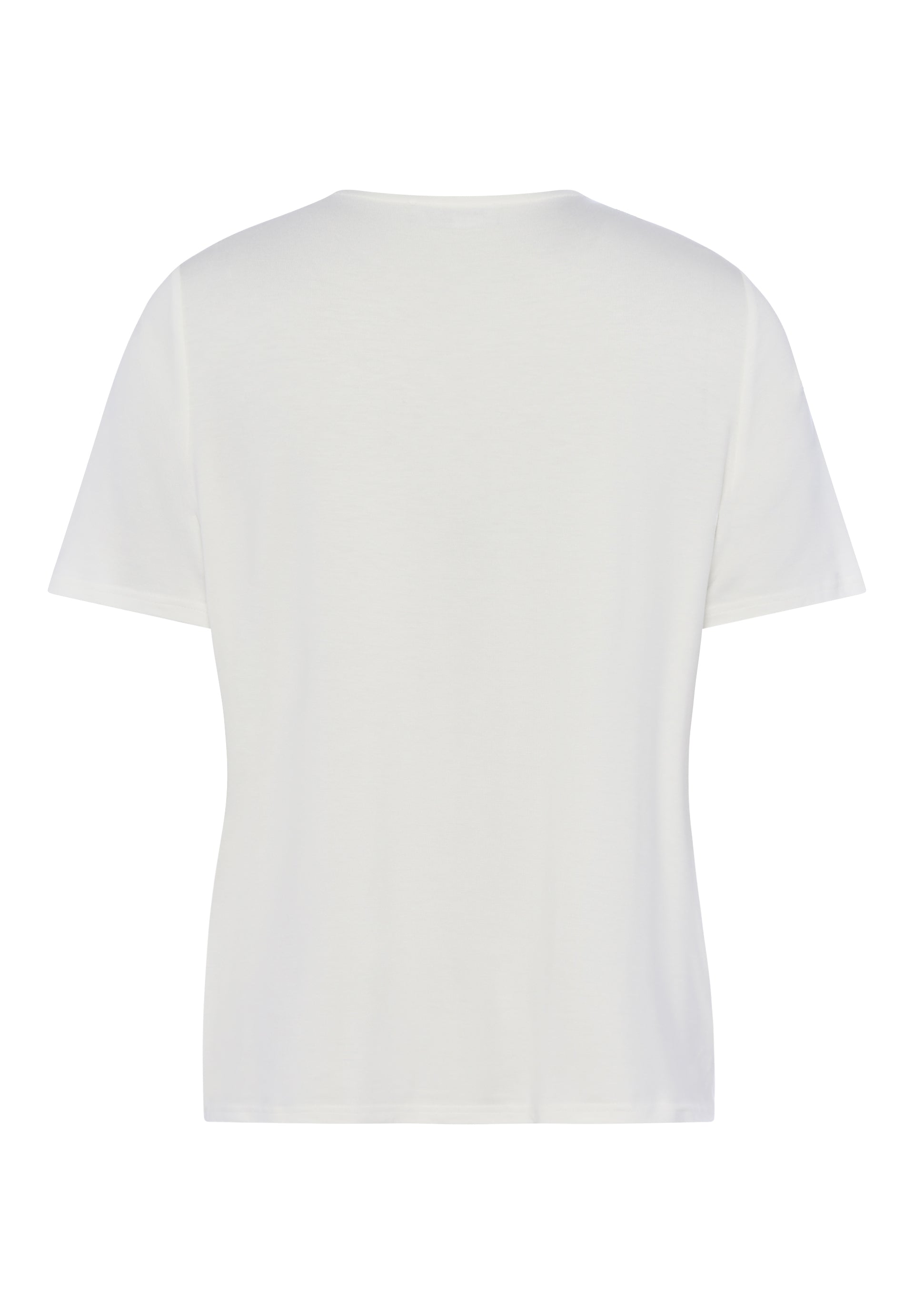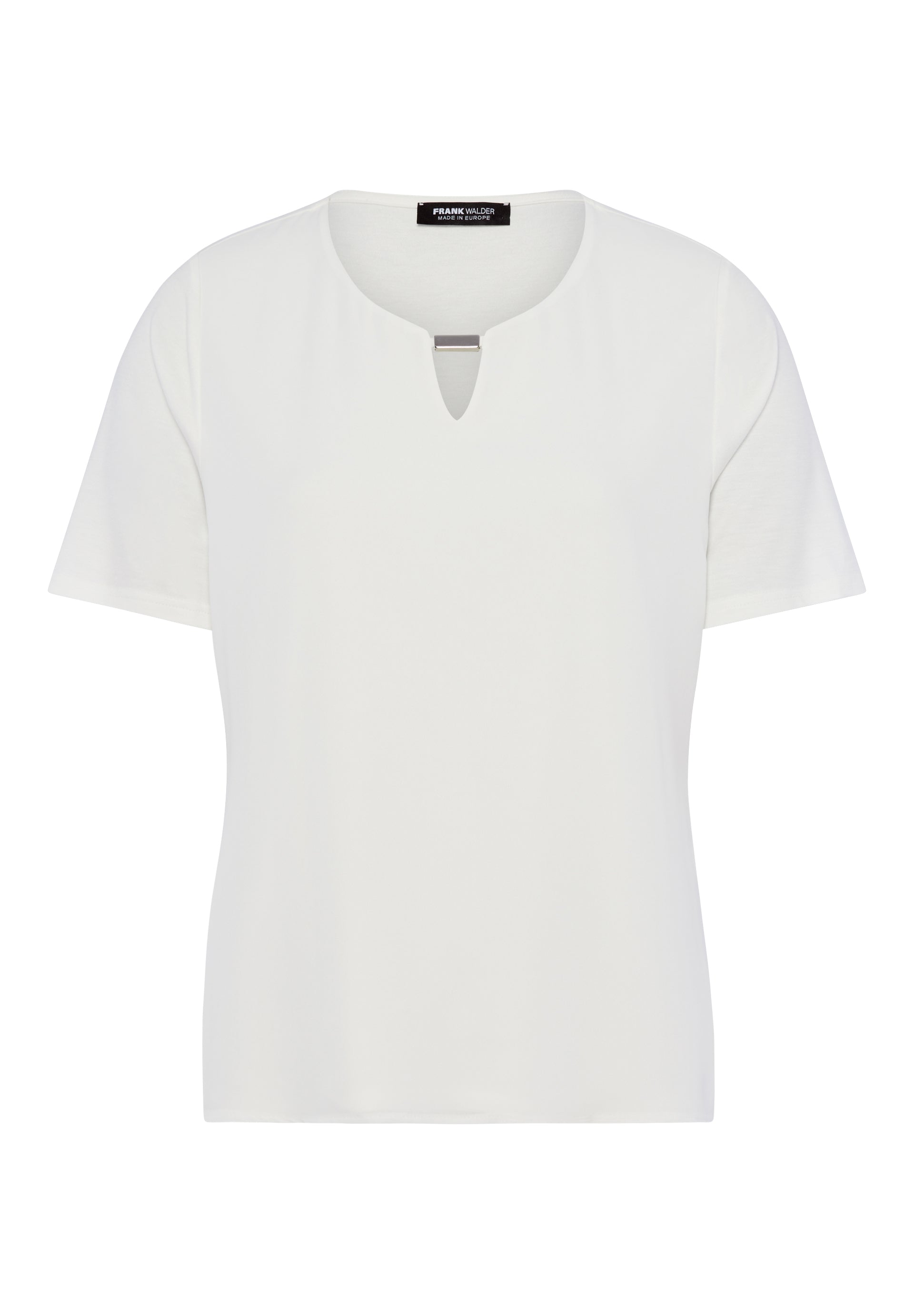 Shirt mit V-Schlitz und Metallsteg am Rundhals; gerade Passform und sanfter Fall für einen cleanen, modernen Everyday-Look.
