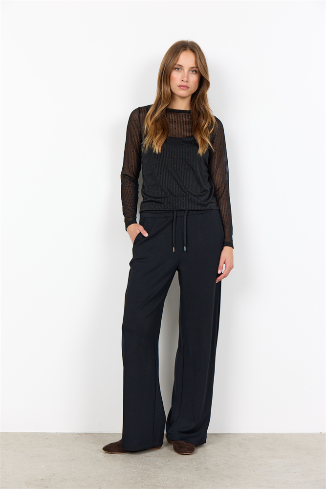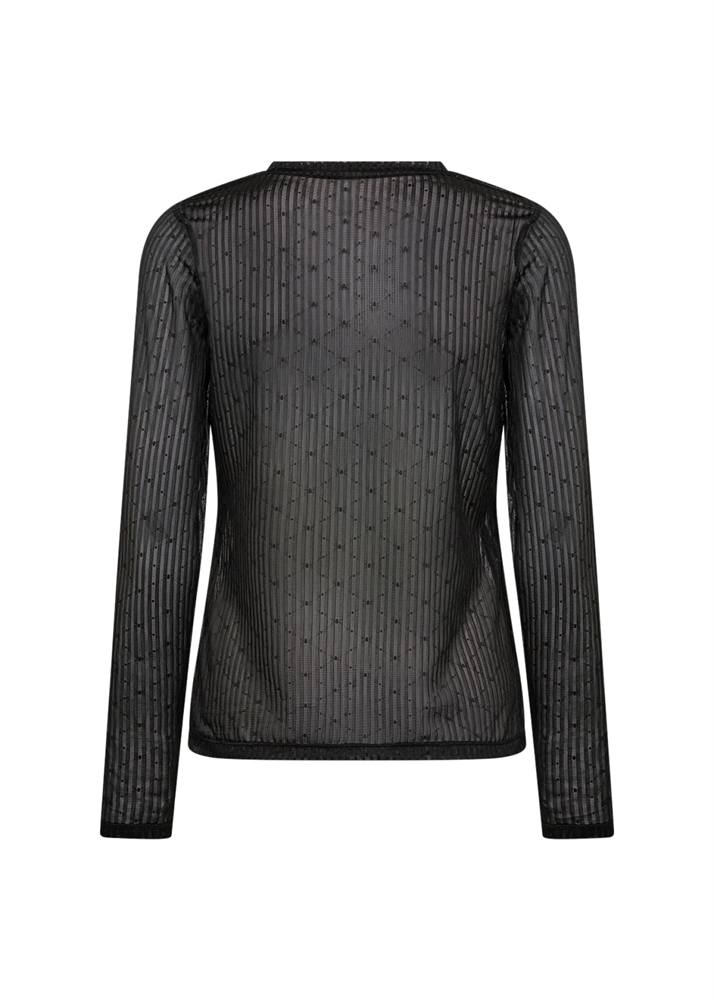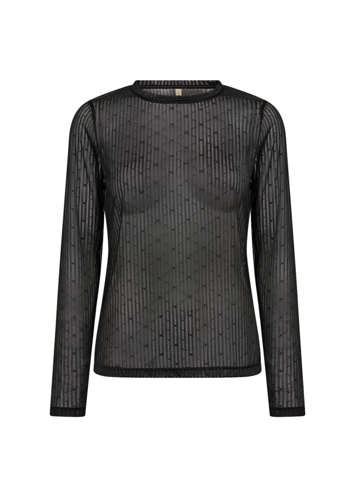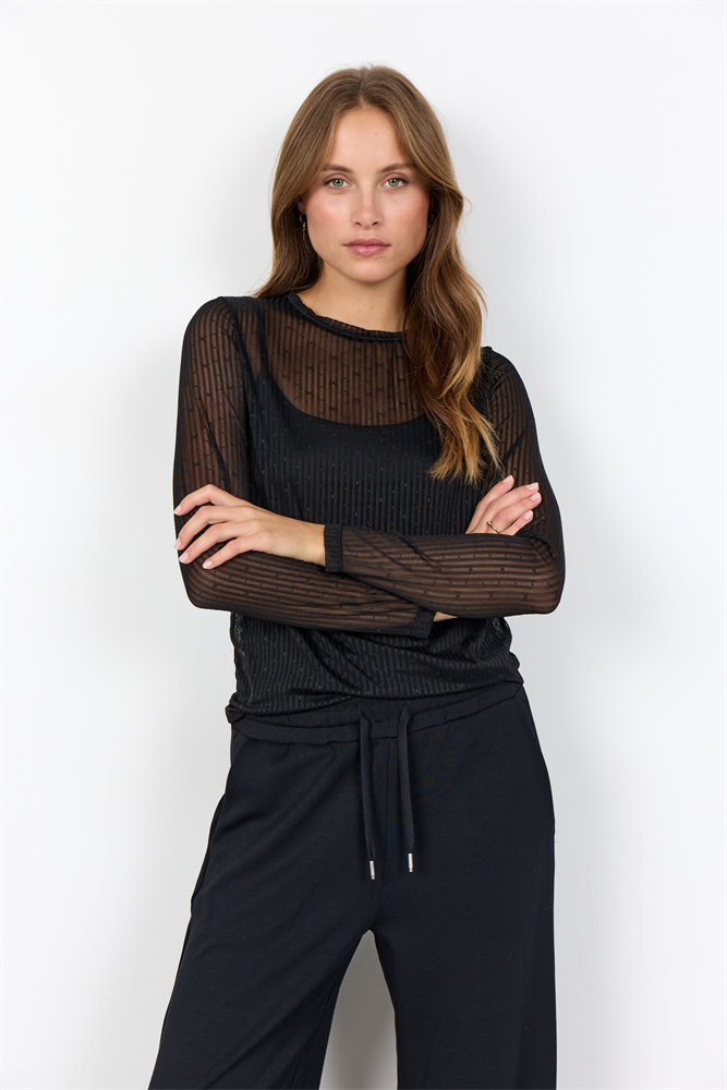 Das SC-ARWEN 1 T-Shirt besteht aus 95% Polyamid und 5% Elastan. Es hat einen halbdurchsichtigen Stoff mit strukturierten Streifen und Punkten, einen Rundhalsausschnitt und lange Ärmel. Kombiniere es mit High-Waisted-Jeans für einen coolen und einzigartigen Look.