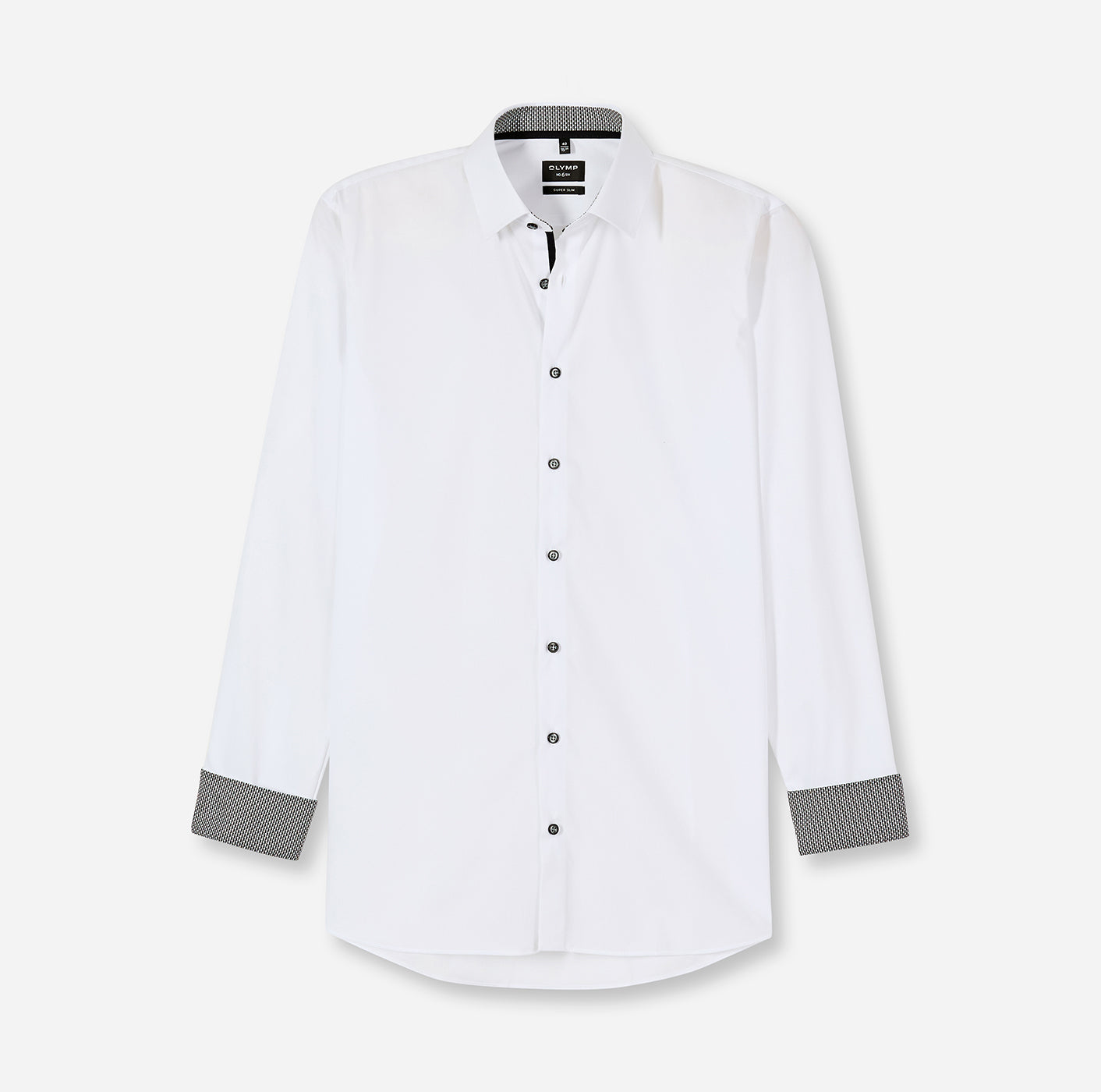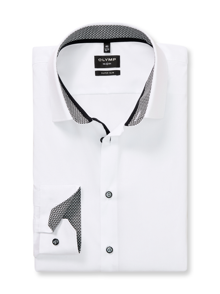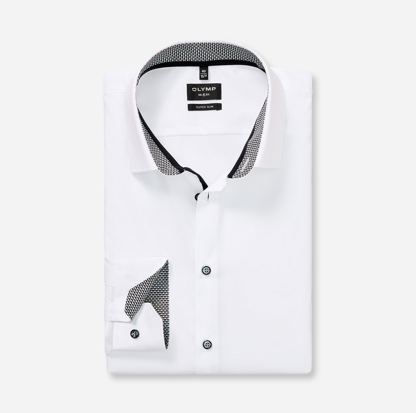 OLYMP No. Six super slim ist das sehr stark taillierte und körpernahe Businesshemd für superschlanke Männer. Die trendige Verjüngung der Silhouette unterstreicht die Körperbetonung der sportaffinen Zielgruppe. Der modische Urban-Kent-Kragen setzt mit dem kontrastiven Innenkragen-Besatz ein wirkungsvolles Detail im Sinne einer dynamischen Performance. Besonders bügelleicht und zertifiziert nach Oeko-Tex Standard 100.