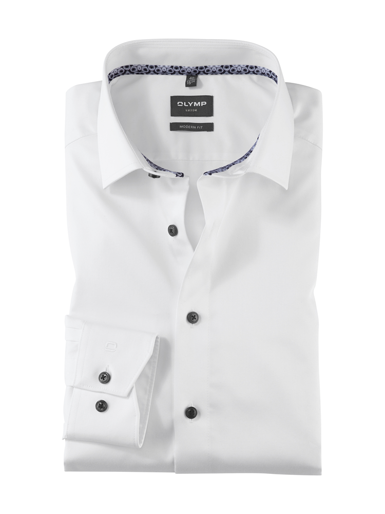 Glatte Oberfläche und cooles Gefühl auf der Haut, das OLYMP Luxor modern fit aus Satin sorgt für den glänzenden Auftritt. Es ist aus feinen Baumwollgarnen in Atlasbindung gewebt und in körpernaher Linienführung geschnitten. Modisch vollendet mit einem Global Kent. Pflegeleicht und vor allem zeitsparend bügelfrei.