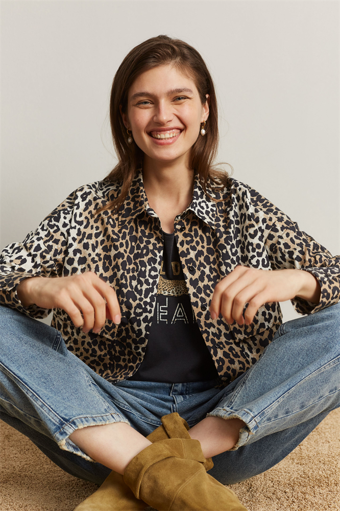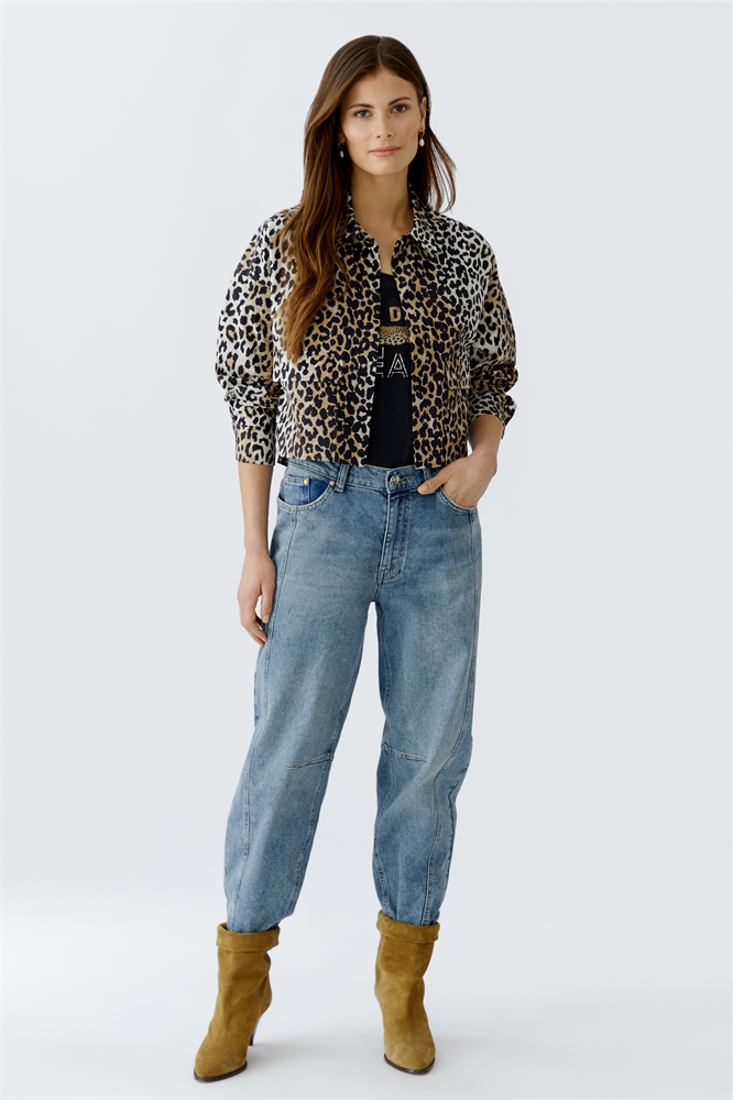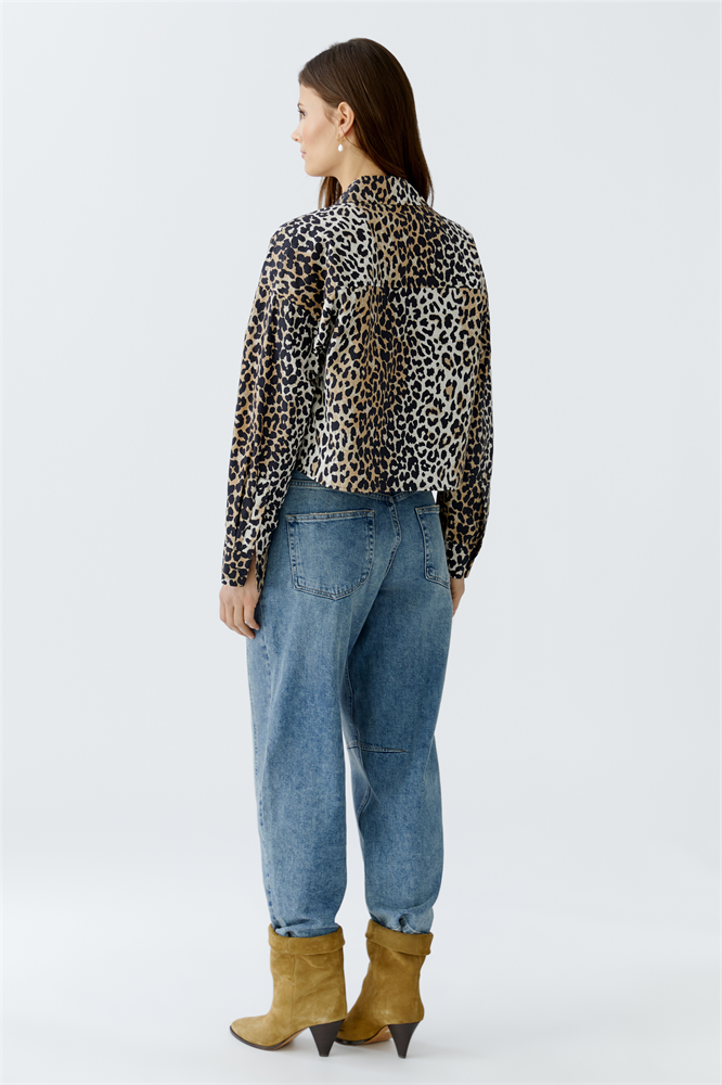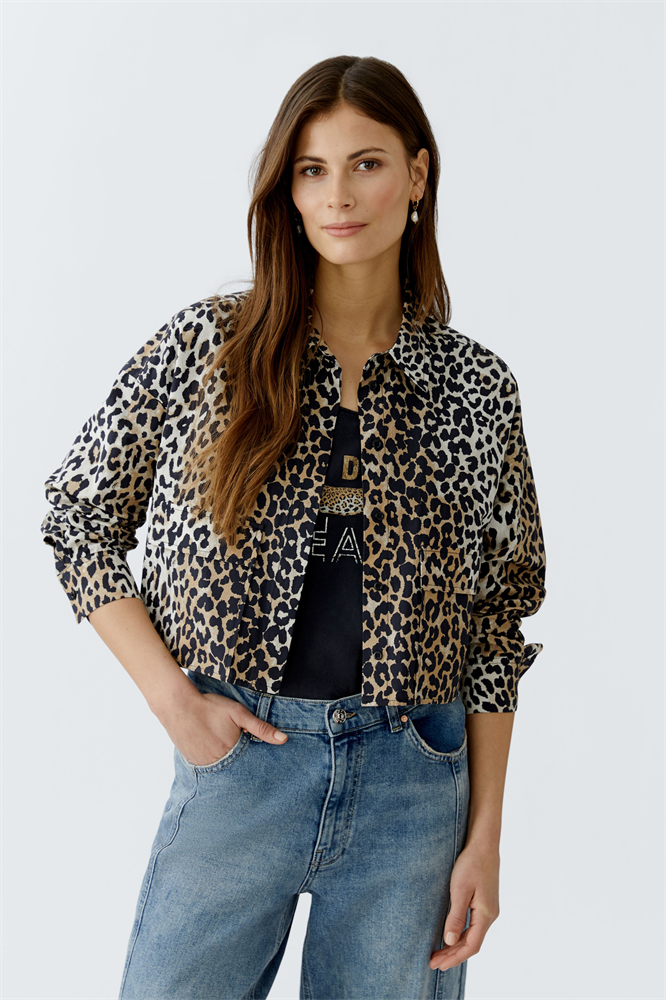 Reine Baumwolle im ikonischen Oui gebrandetem Leo Alloverdesign Boxy geschnitten, verkürzte Länge Klassischer Hemdblusenkragen mit durchgehender, verdeckter Druckknopfleiste Leicht überschnittene Schulter mit Langarm, Manschette mit Knopfverschluss Große aufgesetzte Taschen mit Patte Seitliche kurze Schlitze, hinten minimal verlängert * Länge bei Größe 36: 54cm