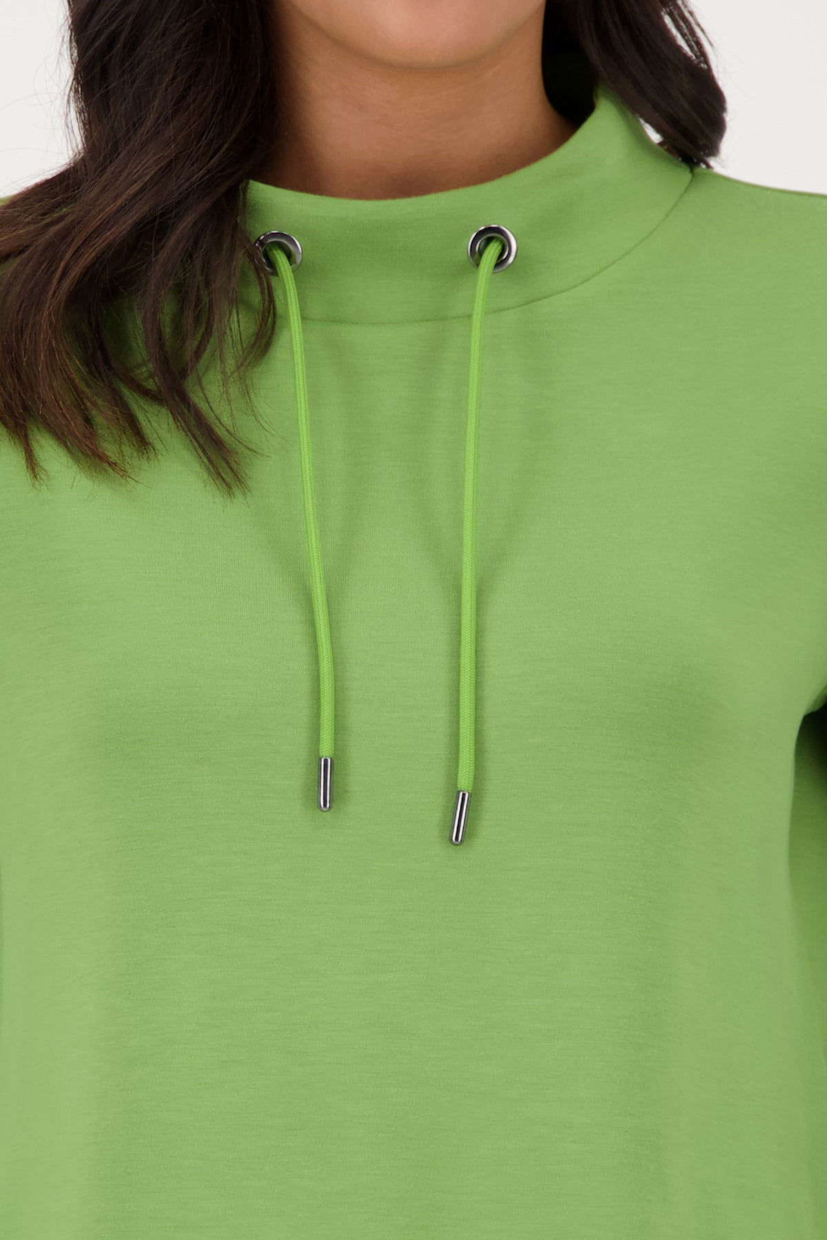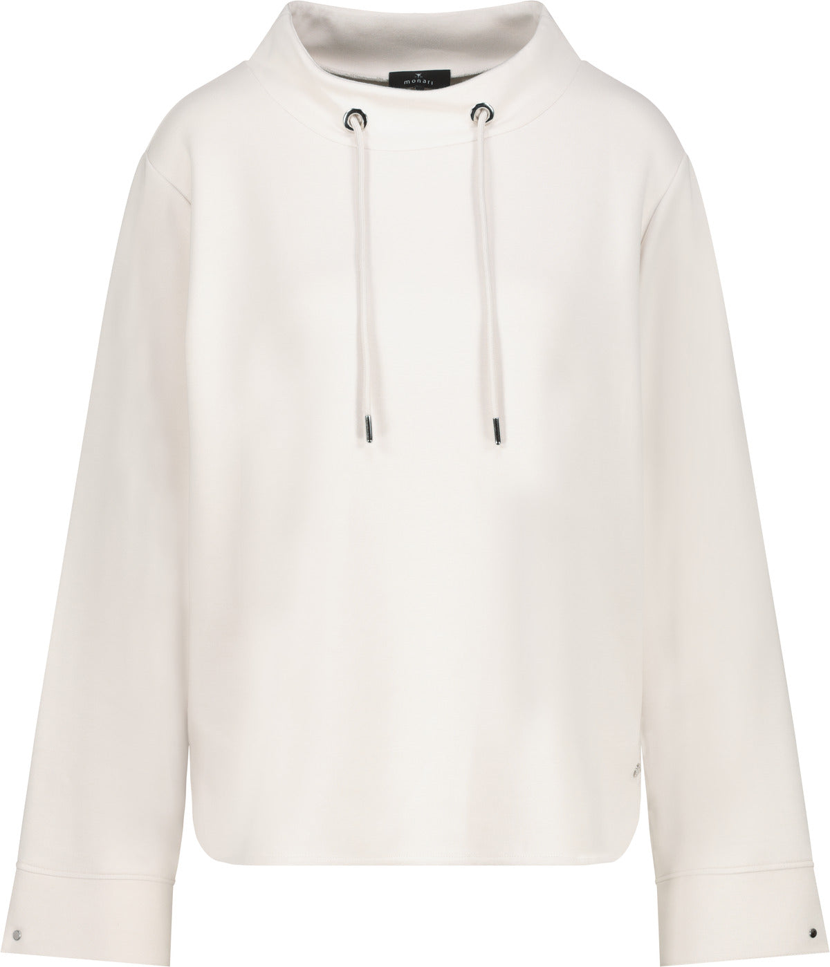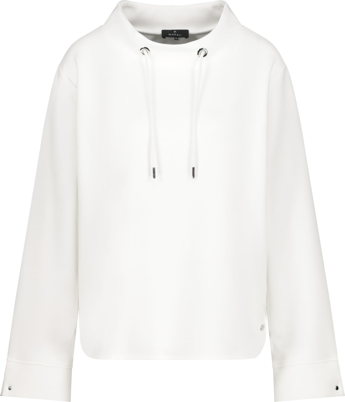 Dieses Sweatshirt aus elastischem Modal überzeugt durch seine sanfte Haptik und modernen Details. Der Stehkragen mit Bindeband sorgt für einen lässigen Look, während der breite Ärmelsaum mit Schlitz und Niete stilvolle Akzente setzt. Abgerundete Vorder- und Rückseite runden das Design harmonisch ab.