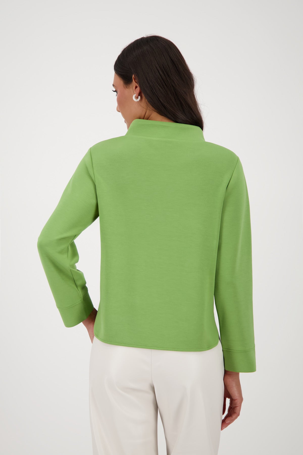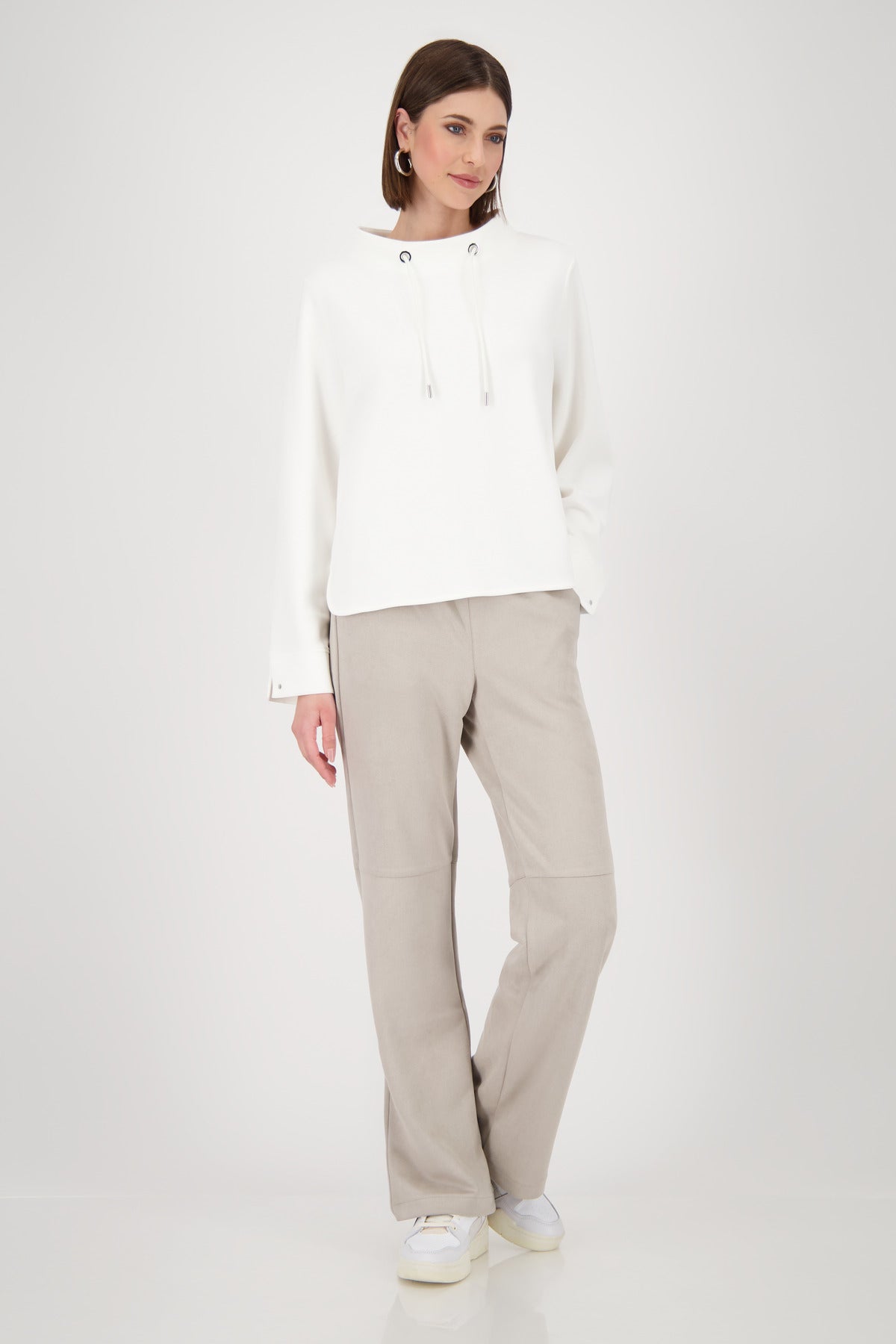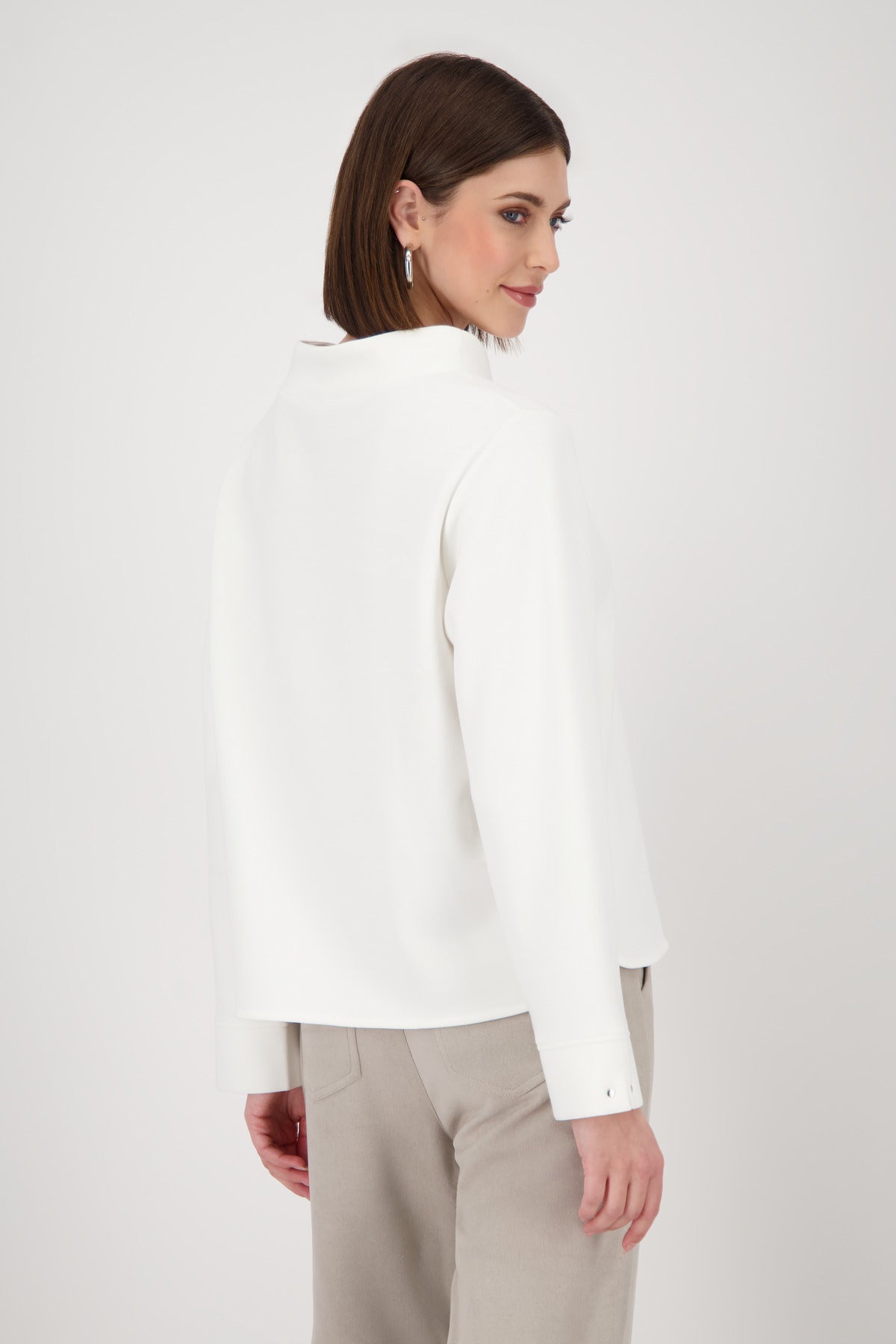Dieses Sweatshirt aus elastischem Modal überzeugt durch seine sanfte Haptik und modernen Details. Der Stehkragen mit Bindeband sorgt für einen lässigen Look, während der breite Ärmelsaum mit Schlitz und Niete stilvolle Akzente setzt. Abgerundete Vorder- und Rückseite runden das Design harmonisch ab.