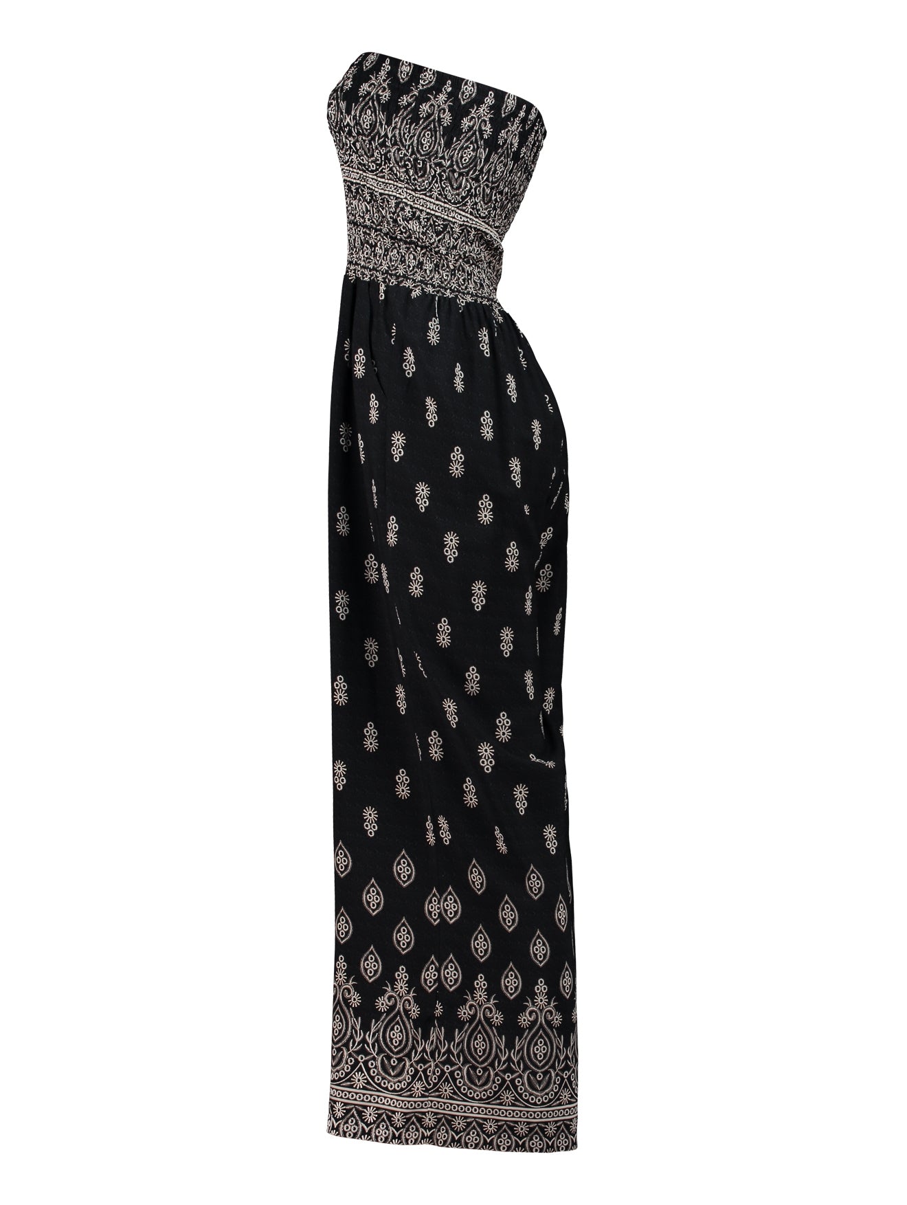 Gemusterter Jumpsuit ohne Ärmel. Lange, weite Beine.