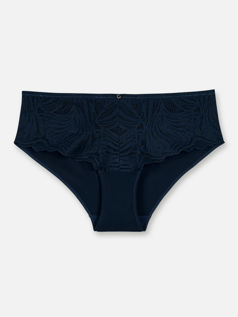Queen of Palms besticht durch den Einsatz von detailverliebter Spitze in elegantem Dunkelbau. Das stilvolles Blätterdesign ist durch die Kombination mit glatter Microfaser unterstrichen. Die Pant ist im Vorderteil aus eleganter Spitze gearbeitet und besticht durch die Kombination mit Microfaser im Rückenteil.