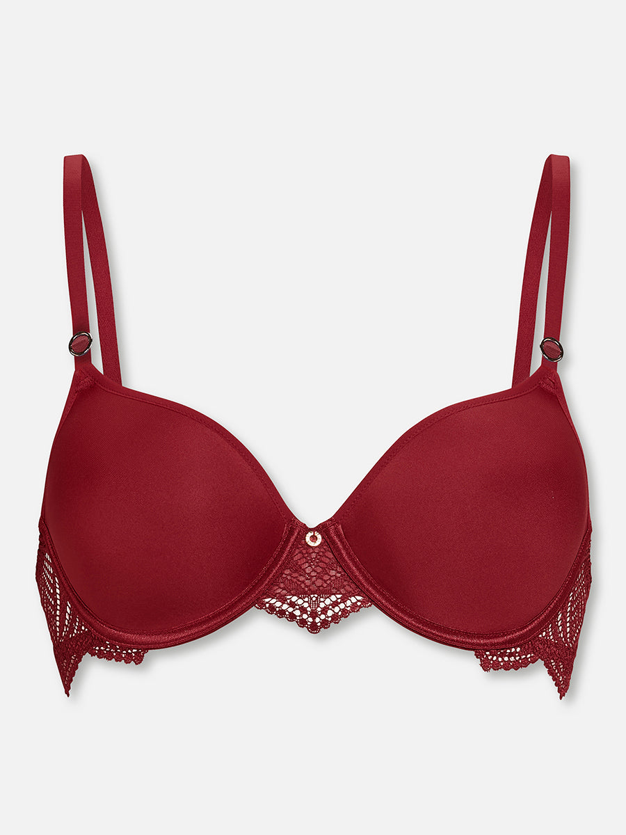 Die dekorative Gallonspitze und das satte Dunkelrot der Mikrofaser machen den Spacer BH der Leafy Charm Serie zum absoluten Highlight. Effektvolle Spitzenbögen in der BH-Mitte und der hohe Stretchanteil sorgen für optimalen Halt und Komfort. Perfekt für jeden Tag.