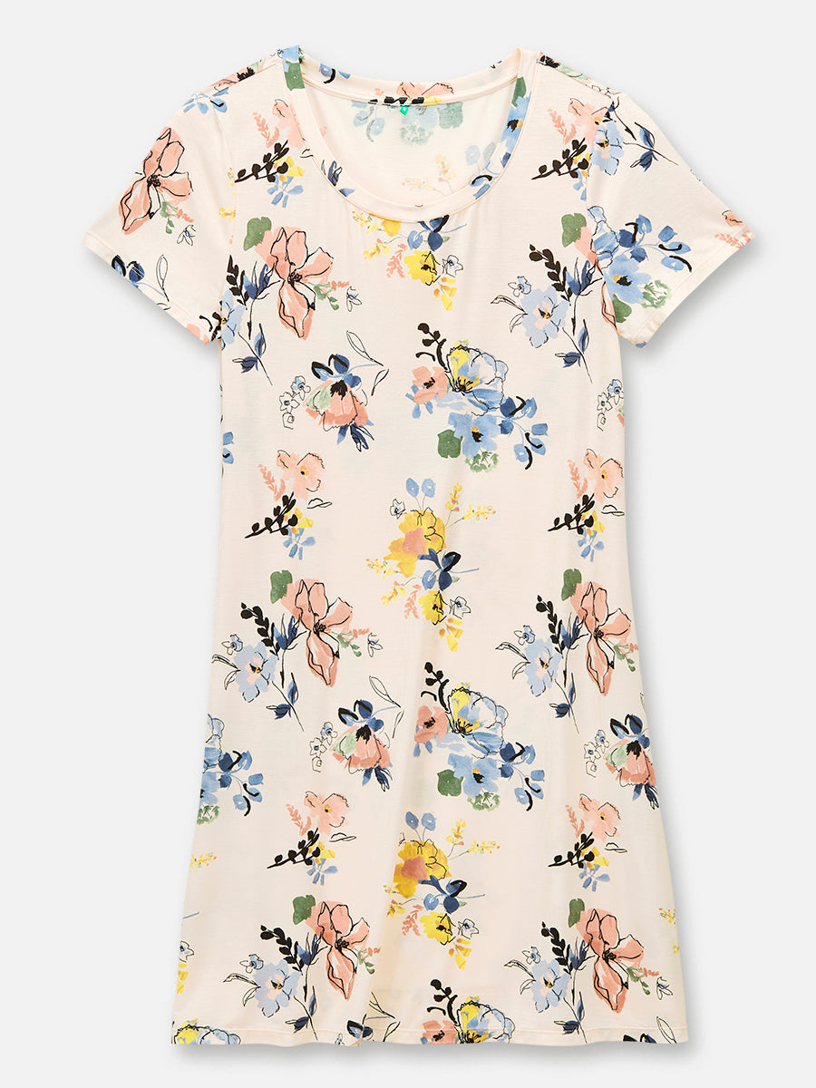 Diese Nachtwäsche Serie bringt Frühlingsgefühle! Das Nachthemd im A-Linien Schnitt in einem floralem buntem Aquarell Druck ist aus einer feinen Viskose Mischung gefertigt. Ein Material, das sich perfekt Ihrem Körper anschmiegt! Länge: 87 cm