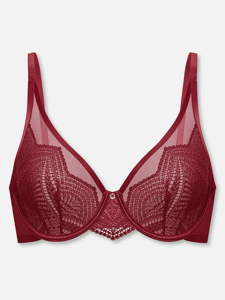 Florale Gallonspitze und tiefes Dunkelrot zeichnen den Bügel BH der Leafy Charm Serie aus. Effektvolle Spitzenbögen in der Mitte und Mikrofaser mit hohem Stretchanteil bieten perfekten Halt und Komfort.