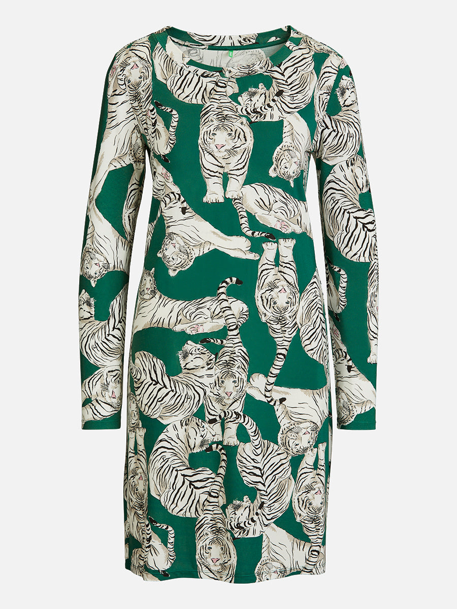 \Maximaler Komfort trifft auf stilvolles Design im Nachthemd der Tiger Spirit Serie. Der lebendige Tiger-Druck auf dunkelgrünem Stoff macht dieses Nachthemd zu einem besonderen Highlight. Feinstes Modal von TENCEL™ sorgt für ein unglaublich weiches Tragegefühl. Länge: 90 cm\""