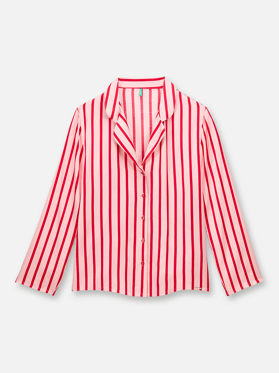 Dieses Oberteil mit klassischem Streif in Pink-Rot ist aus weichem, gewebtem Viskose-Satin gefertigt. Der Reverskragen und die durchgehende Knopfleiste sind zusätzlich hochwertige Details.