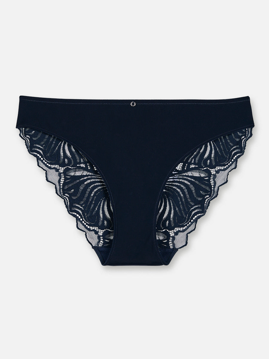 Queen of Palms besticht durch den Einsatz von detailverliebter Spitze in elegantem Dunkelbau. Das stilvolles Blätterdesign ist durch die Kombination mit glatter Microfaser unterstrichen. Der Tai Slip ist im Rückteil aus eleganter Spitze gearbeitet und besticht durch die Kombination mit Microfaser im Vorderteil.