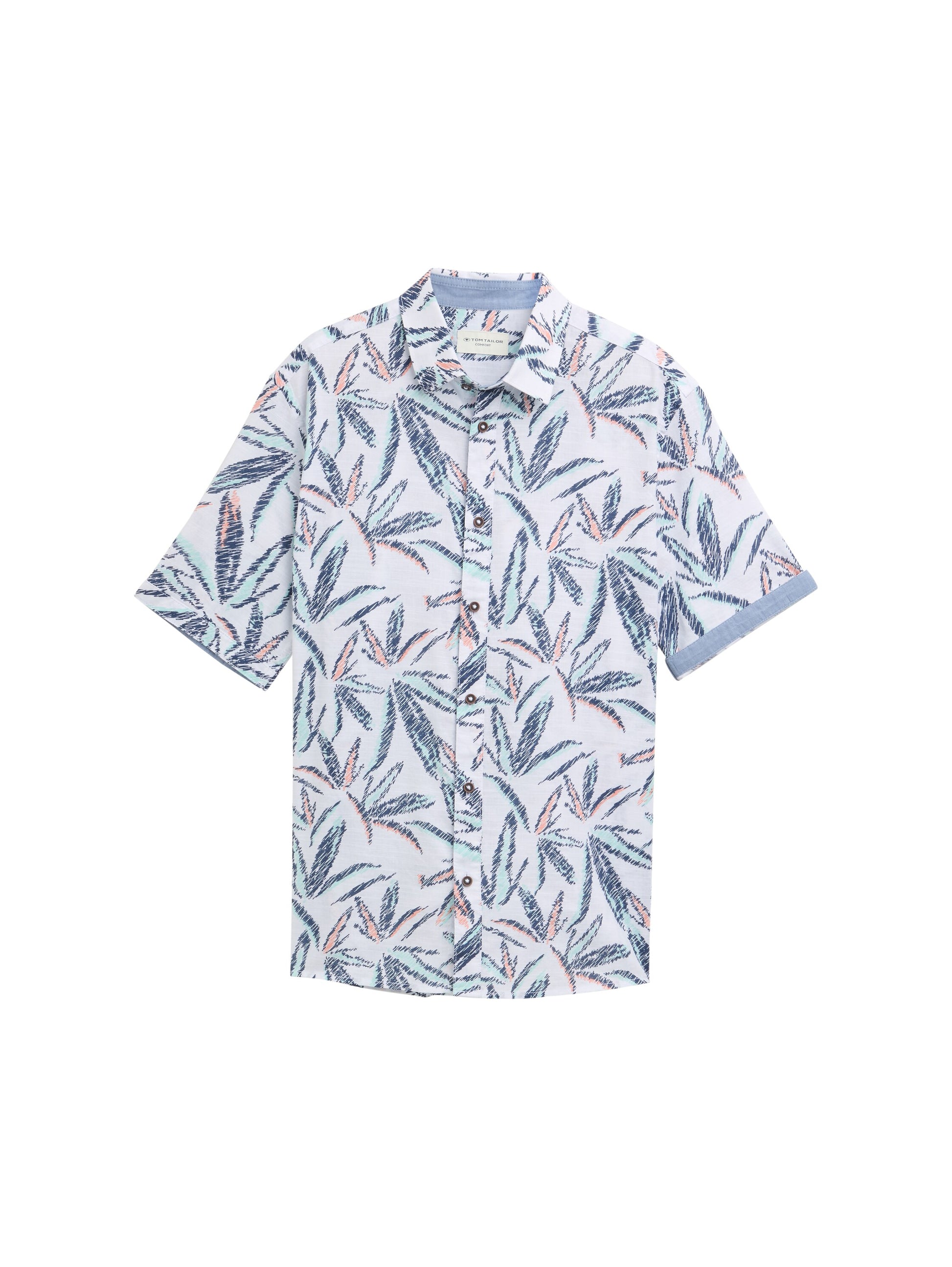 * Gemustertes Chambray Hemd im Palmen-Motiv für den Frühling und Sommer. Aus einem leichten Baumwollstoff mit kontrastfarbiger Innenseite an den Ärmelabschlüssen.