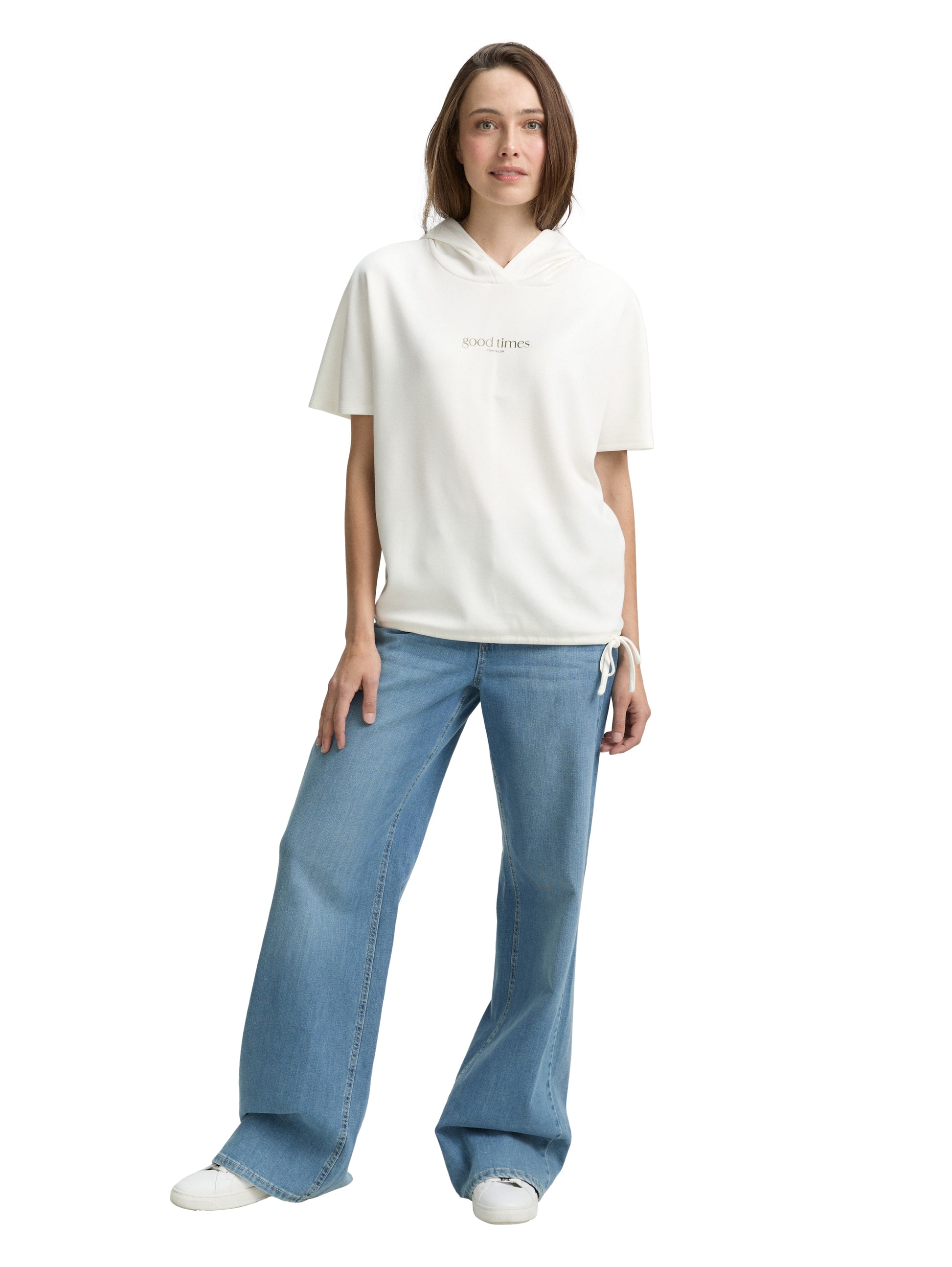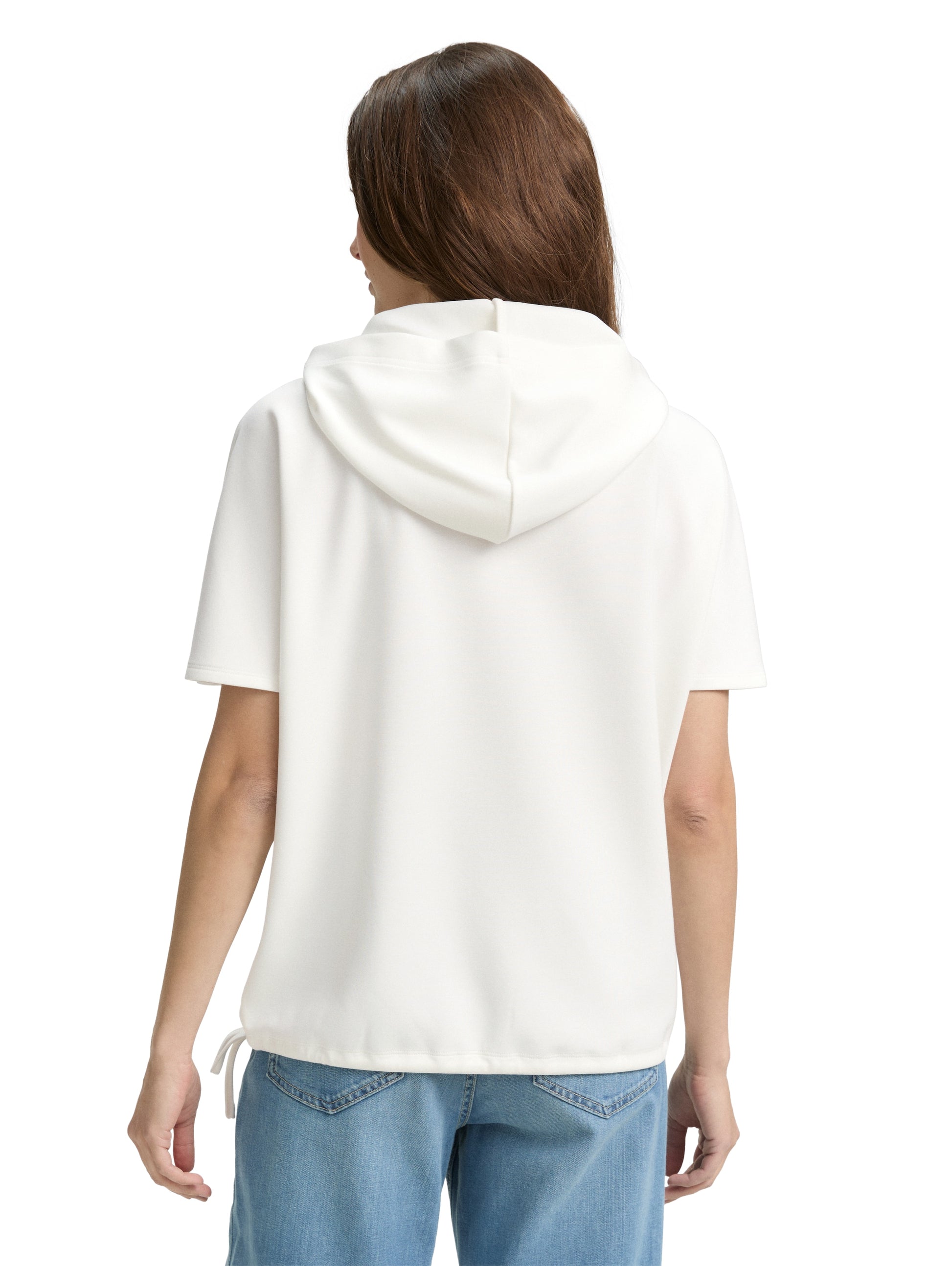 * T-Shirt mit Kapuze, Schriftzug auf der Brust und Kordelzug am Saum. Aus einem knitterarmen, elastischen und neoprenähnlichen Scuba-Stoff.