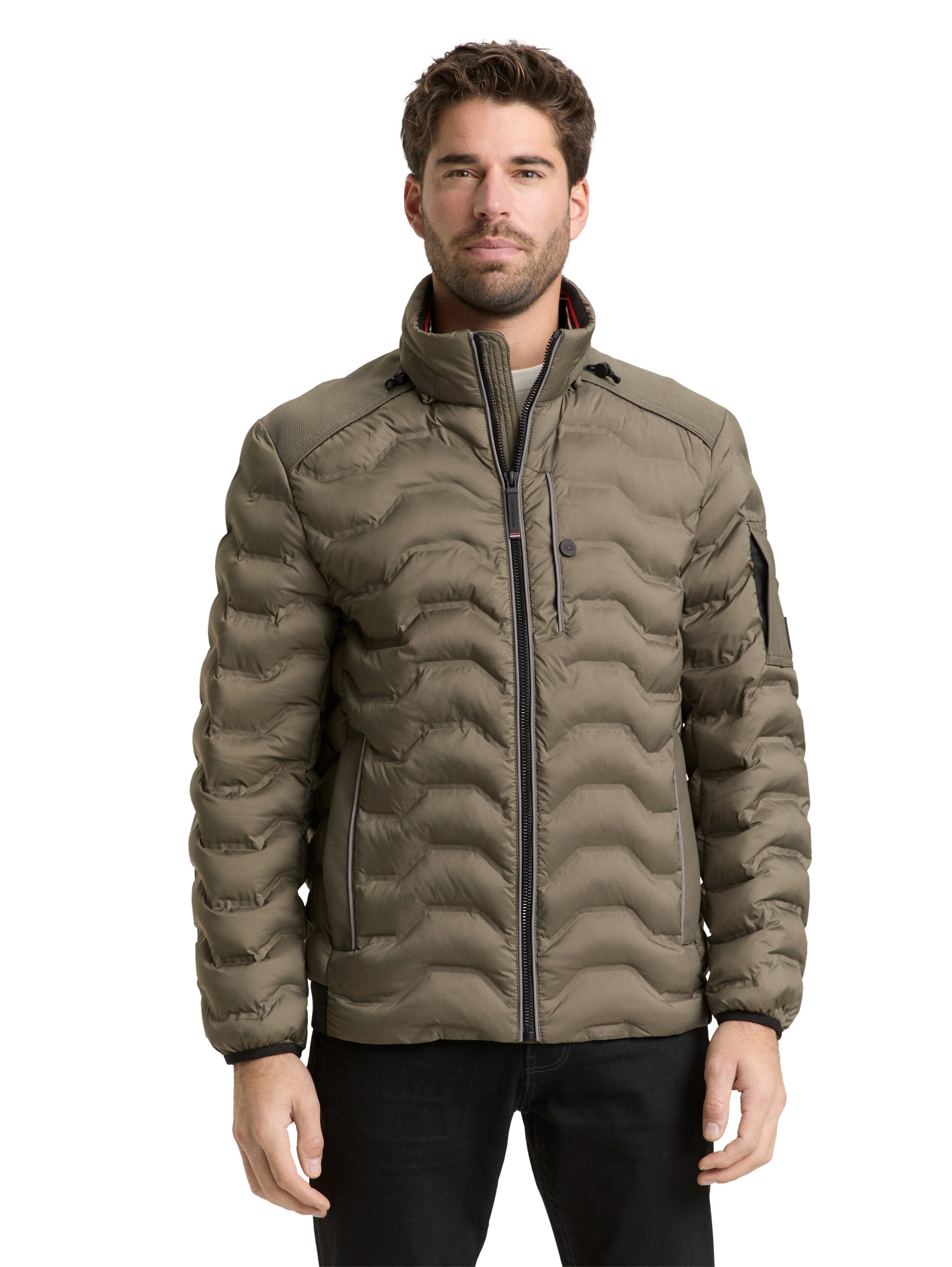 Gesteppte Lightweight Hybrid Jacke mit verstaubarer Kapuze im Kragen. Mit Brusttasche, Ärmeltasche, seitlichen Eingriffstaschen vorne und zusätzlicher Innentasche zum Verstauen von Handy, Schlüssel oder Portemonnaie. Ideal als Übergangsjacke aus einem wasser- und schmutzabweisenden Material.