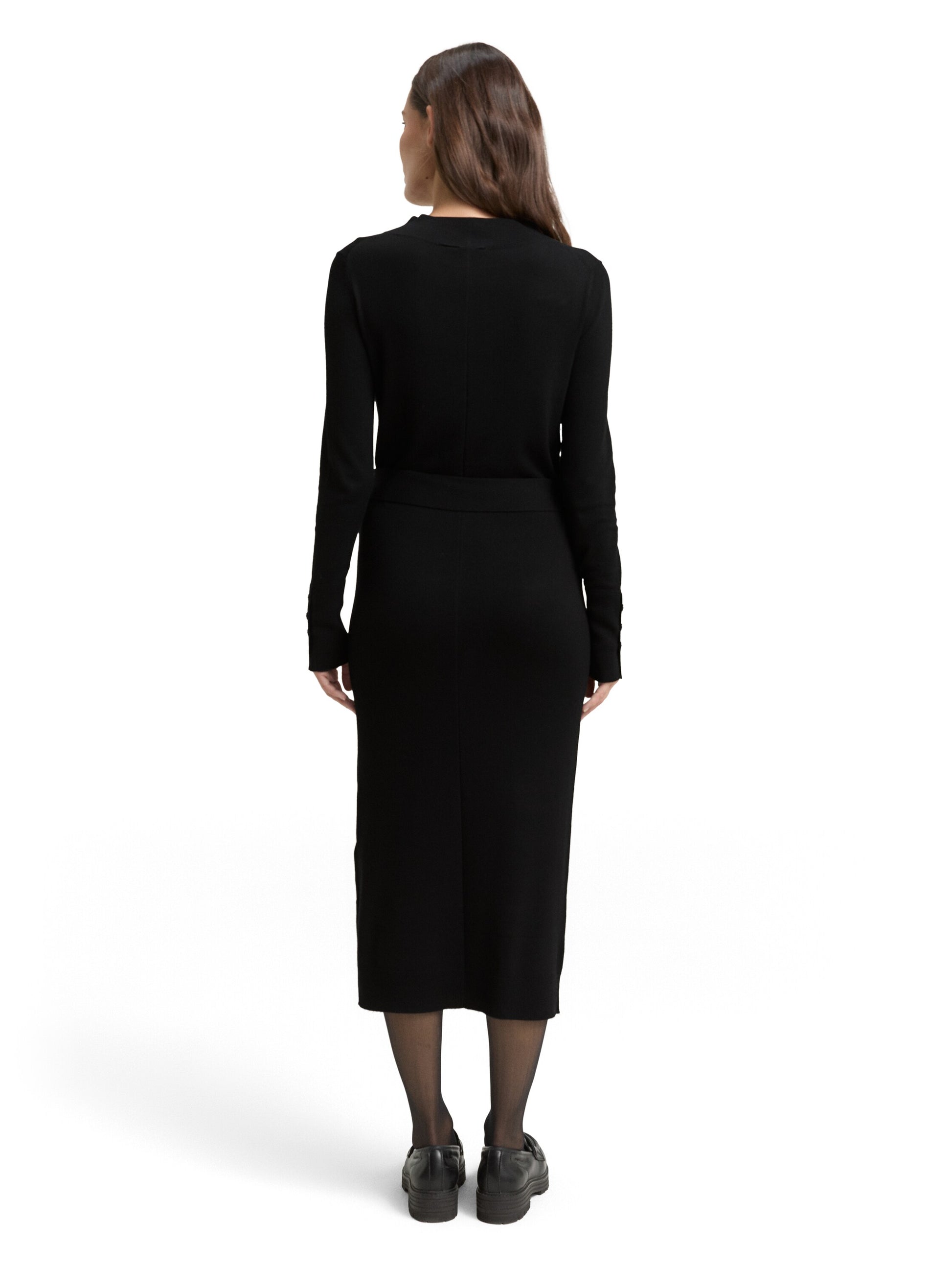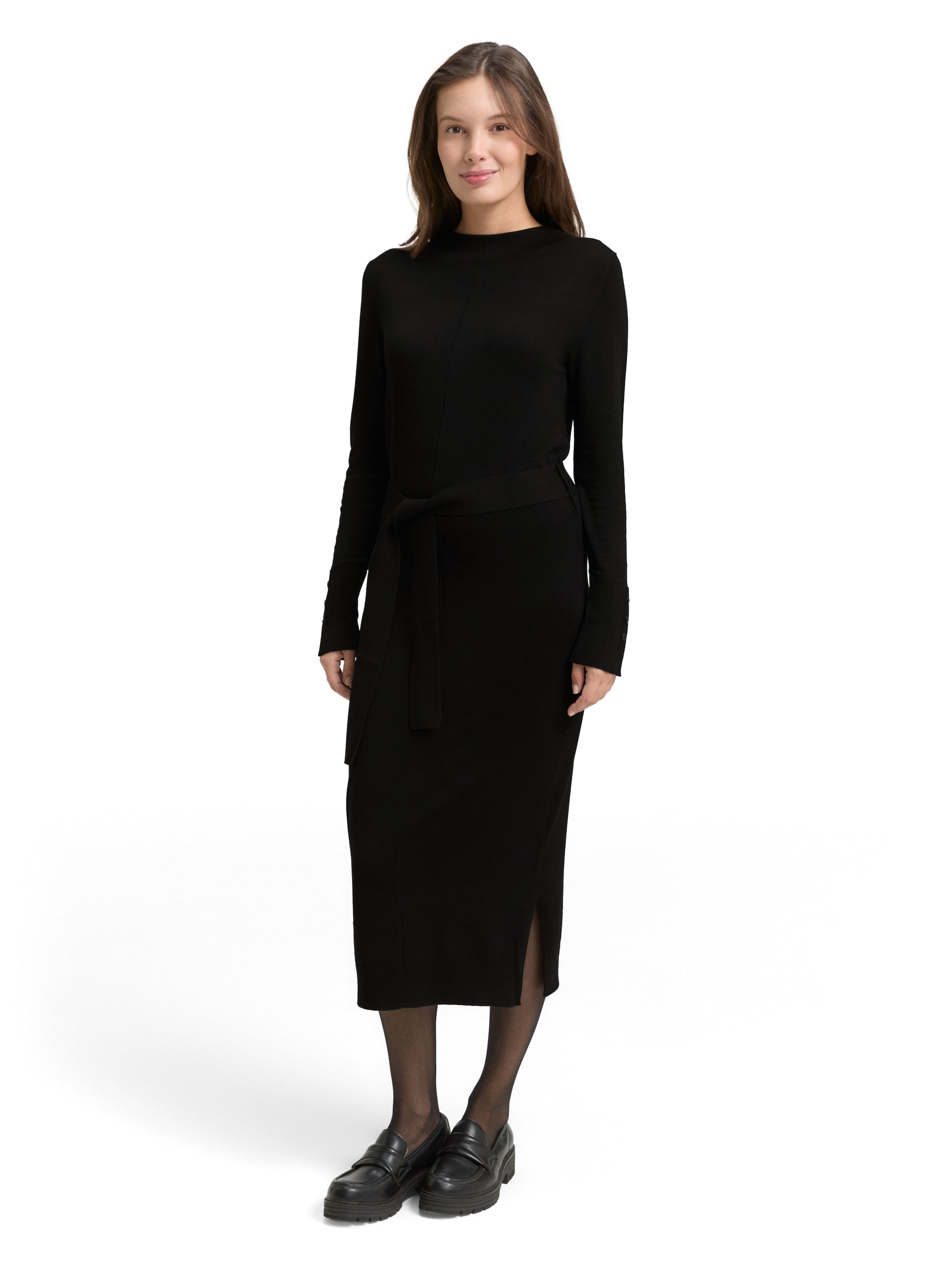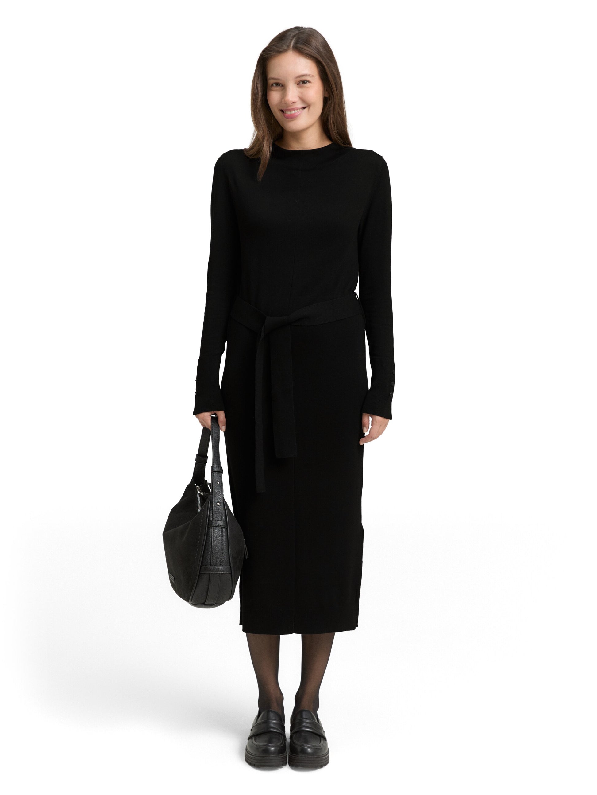 Tailliertes Strickkleid mit Bindegürtel. Mit Stehkragen, Seitenschlitzen und Knopf-Details an den Ärmeln.
