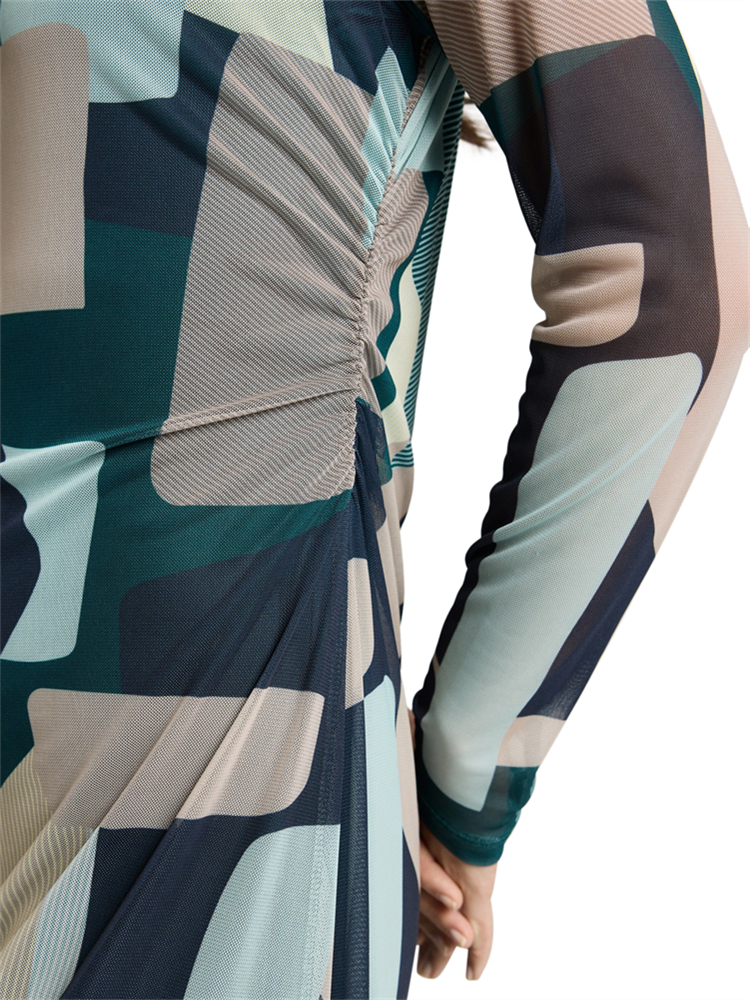 Gemustertes Meshkleid in Midi-Länge mit Raffungen an der Taille. Aus einem fließenden, knitterarmen Mesh-Stoff mit semi-transparenten Ärmeln.