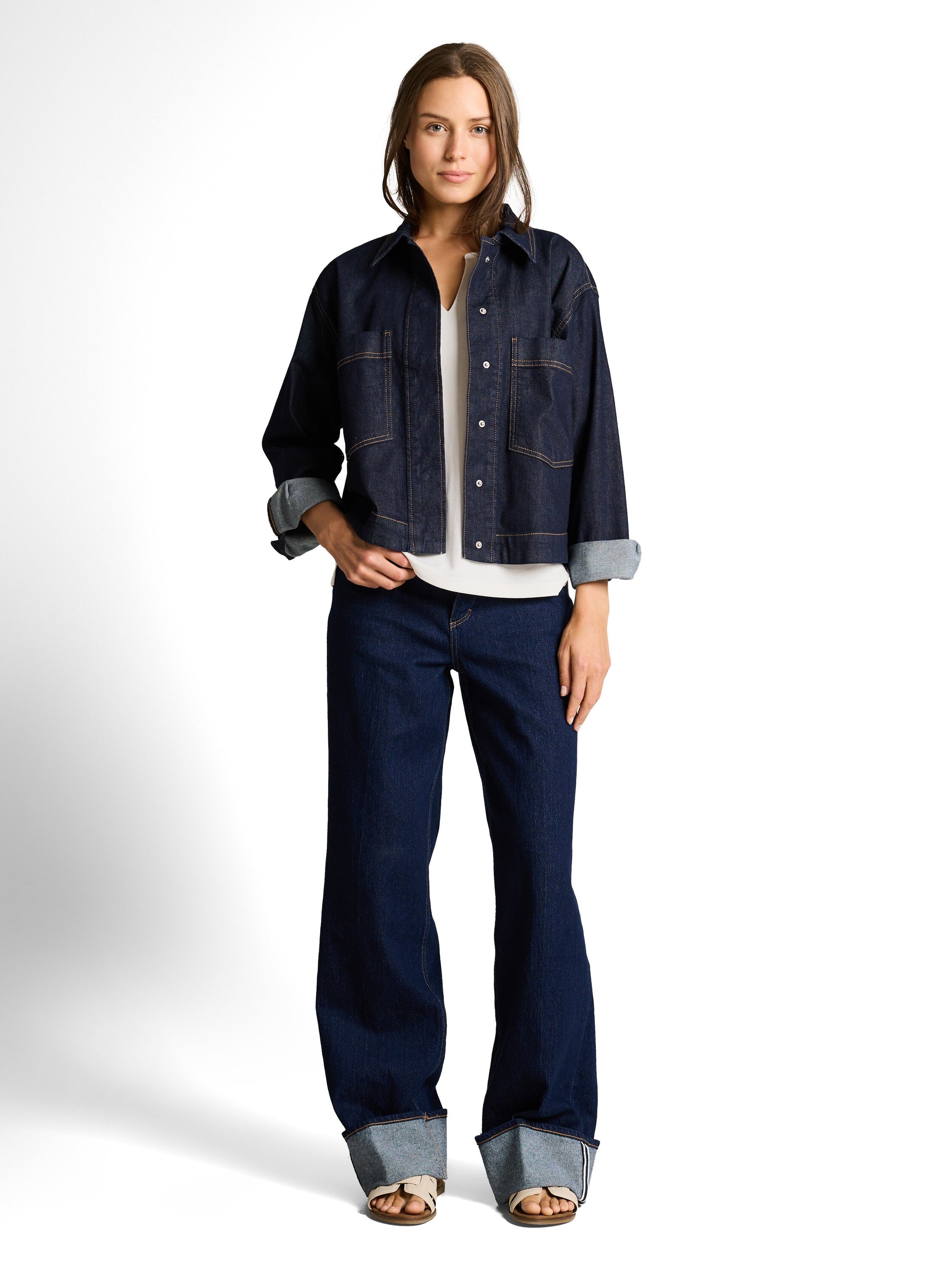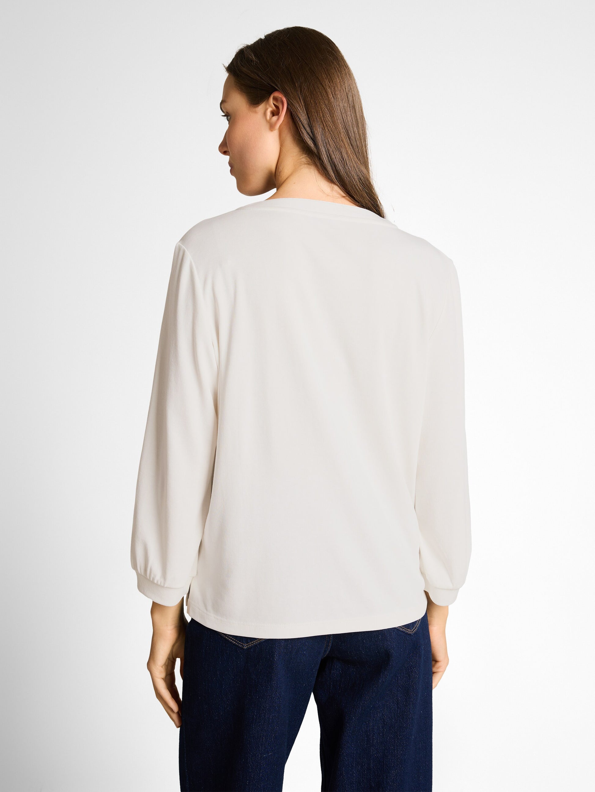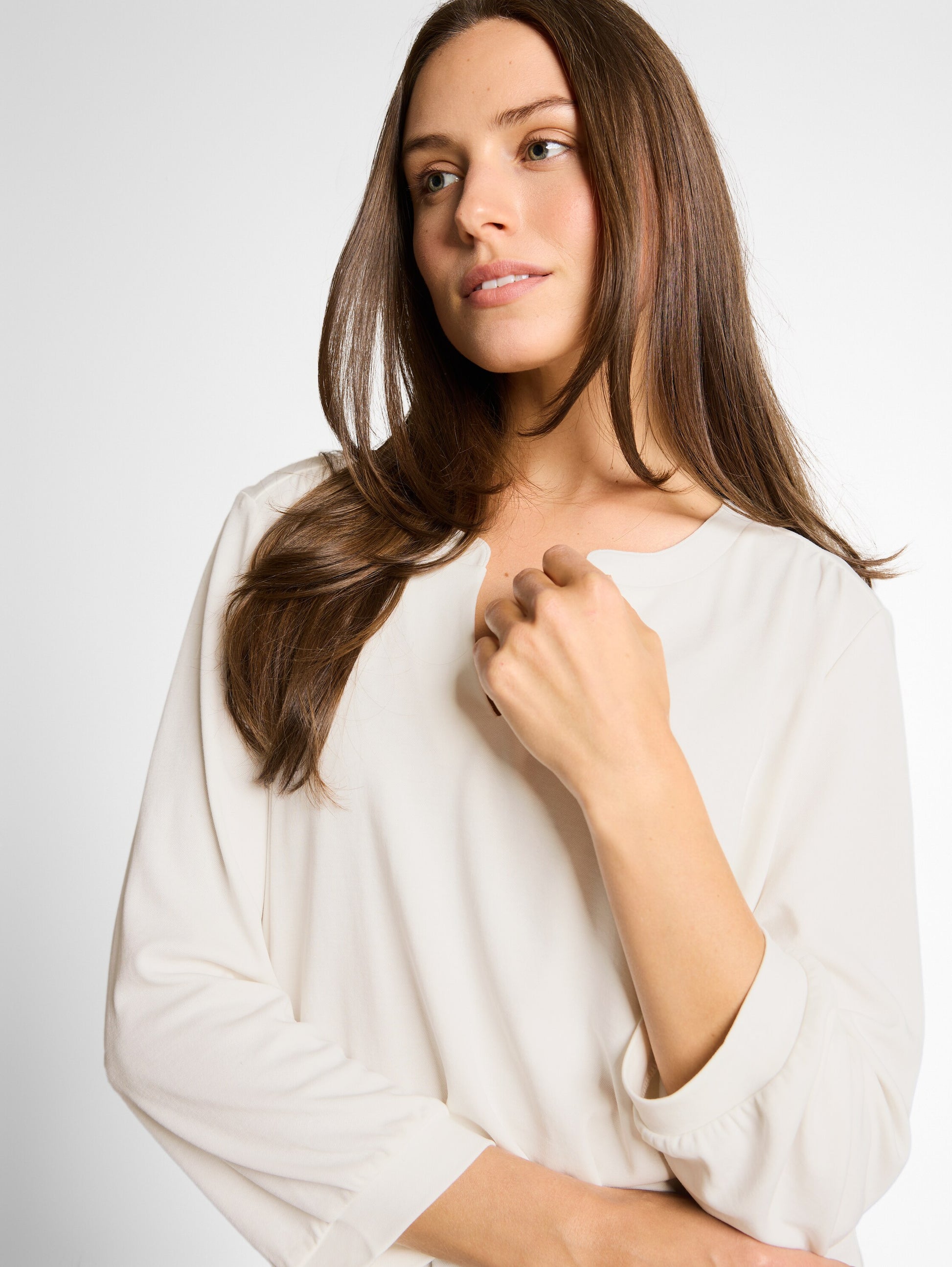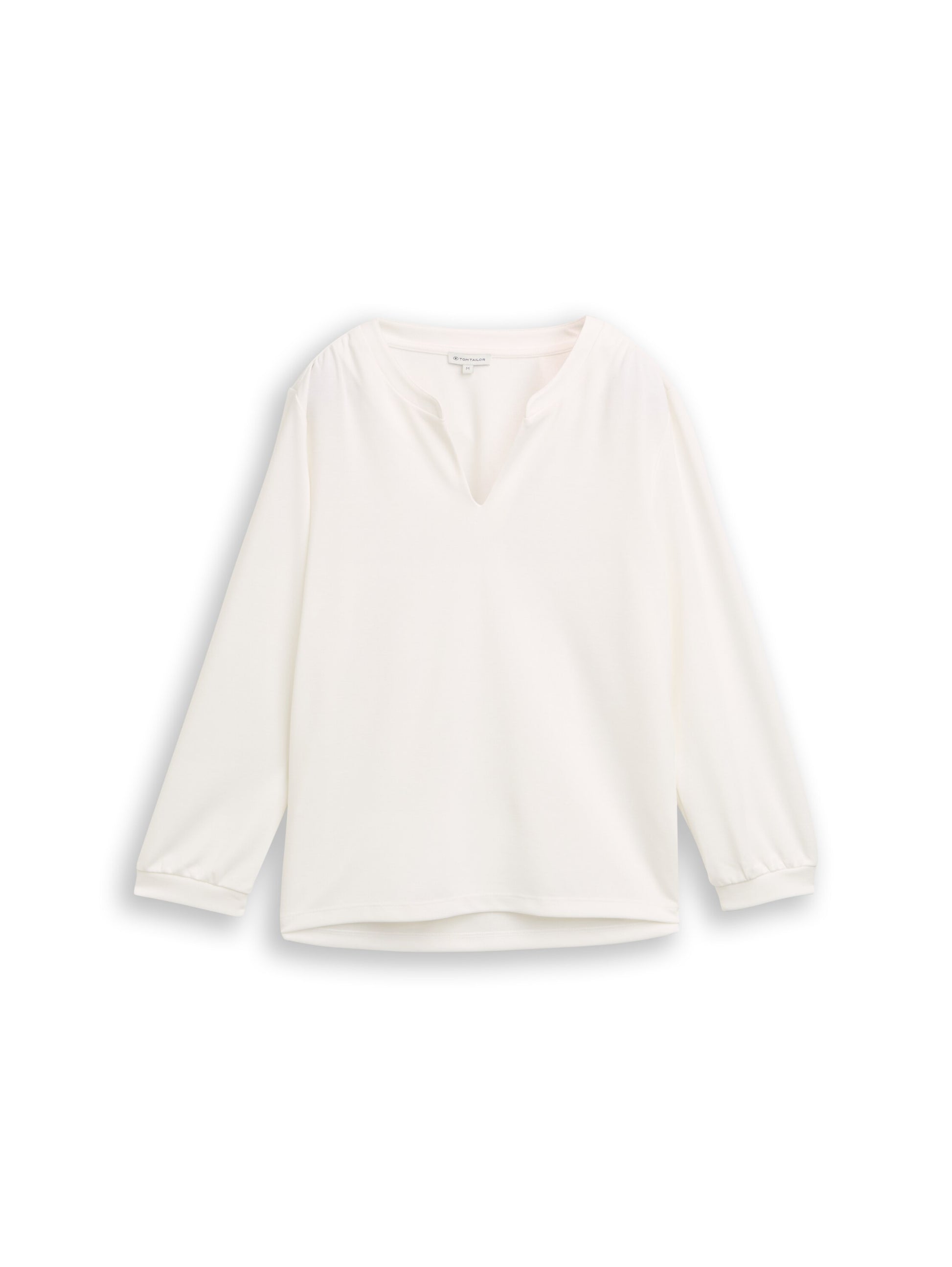 Longsleeve mit leichten Raffungen an den Schultern. Mit kurzen Seitenschlitzen und V-Öffnung am Rundhalsausschnitt.