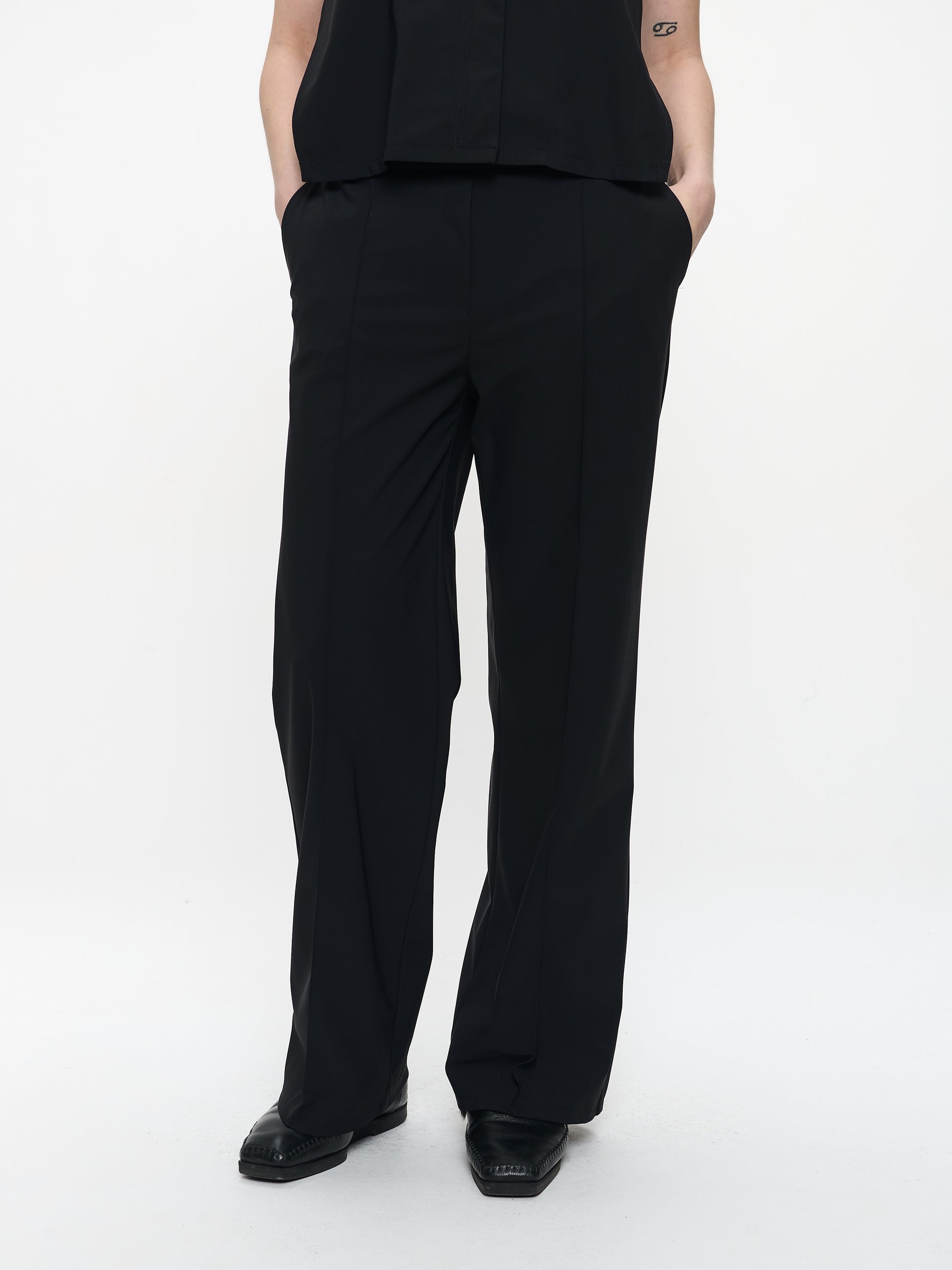 Elegant und funktional – die Thera Pants bieten eine klare Silhouette mit maßgeschneiderten Details. Gefertigt aus gebürstetem technischem Jersey, fühlen sie sich angenehm weich auf der Haut an und bieten gleichzeitig eine dezente Struktur. Die weite Beinform und die Bügelfalten sorgen für einen eleganten Look, während der mittelhohe Bund für alltäglichen Komfort sorgt – perfekt fürs Büro und formelle Anlässe.