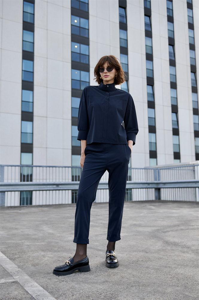 Mit einem markanten strukturierten Design verbindet das Angelika Top sportliche Elemente mit eleganter Raffinesse. Aus weichem technischem Jersey mit gebürsteter Wildlederoptik gefertigt, besticht dieses Top durch seinen modernen Funnelkragen und die schmale Druckknopfleiste. Die ¾-Ärmel und die minimalistische Silhouette machen es zu einem edlen Lagenlook für kältere Tage oder einem selbstbewussten Einzelstück.