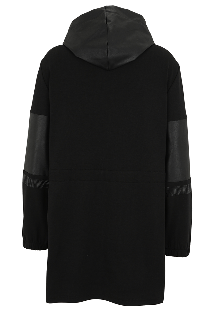 Diese lässige Long-Jacke mit Hoodie von Doris Streich ist aus softem Lederimitat im Mix mit elastischem Punto di Roma Wirkware gefertigt. Der tonige schwarze Strass, der Reißverschluss und die Ösen mit Band runden den Look ab.