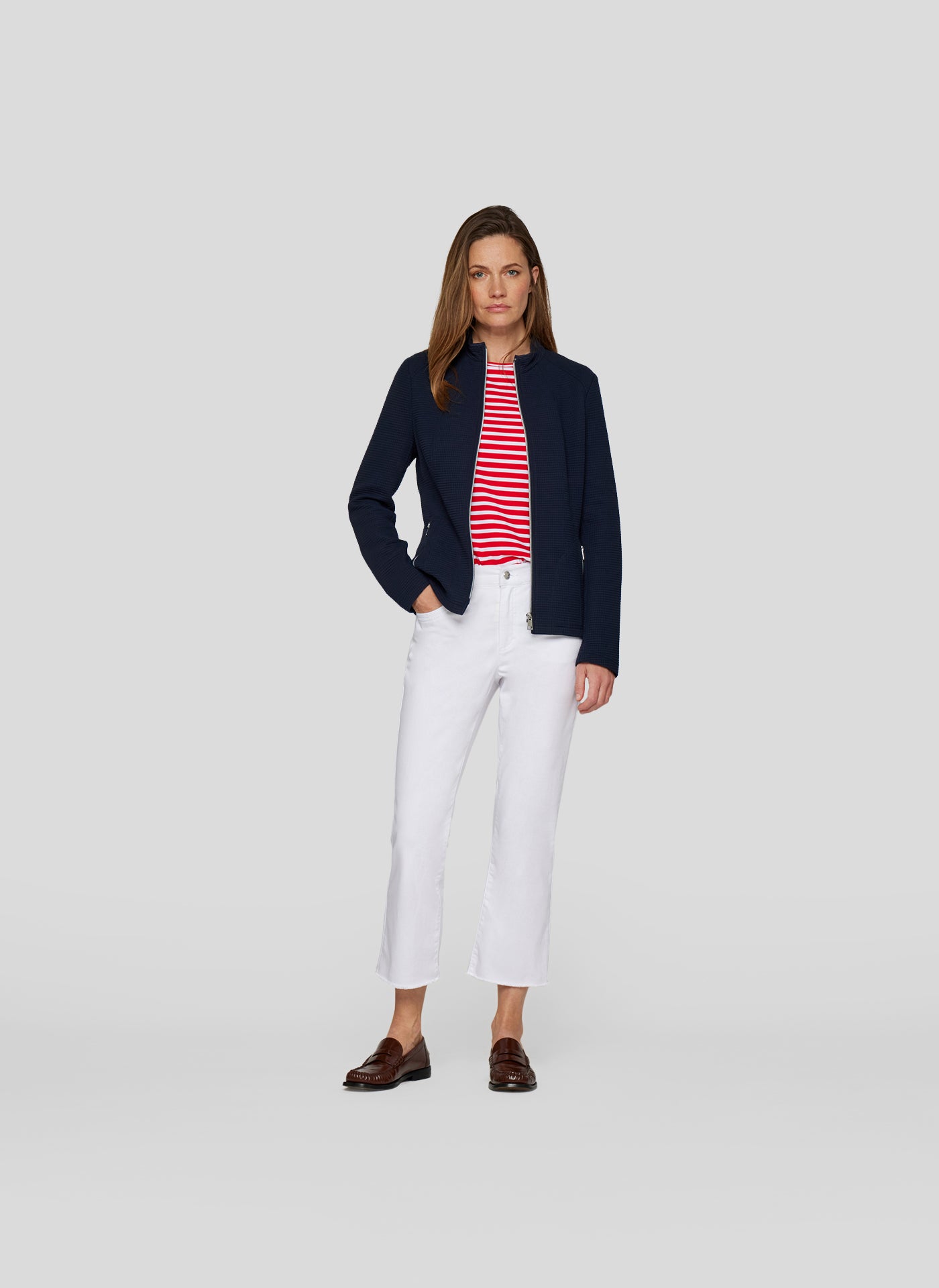 Der strukturierte Stoff sorgt für eine moderne Optik, während die figurbetonte Passform die Silhouette elegant unterstreicht. Der praktische Reißverschluss sowie zwei Zipper-Taschen runden das sportive Design funktional ab. Ein idealer Begleiter für stilbewusste Auftritte im Alltag oder im Büro.Strukturierter Stoff mit stilvoller Oberfläche.Stehkragen für einen sportlich-eleganten Look.Zwei Reißverschlusstaschen als praktische Details.Elastisches, trageangenehmes Material für besten Komfort.