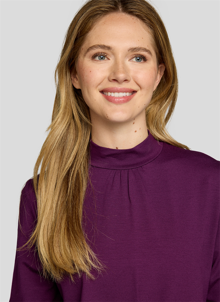 Ein vielseitiger Begleiter für jeden Tag: Dieses Langarmshirt überzeugt mit einem kleinen Stehkragen, der dem Look eine elegante Note verleiht. Die dezente Raffung am Ausschnitt sorgt für eine feminine Silhouette, während das elastische Material für angenehmen Tragekomfort sorgt. Kleiner Stehkragen mit Raffung. Elastischer Saumabschluss. Bequemer Viskose-Elasthan-Mix. Pflegeleicht und formstabil. Ideal für Alltag und Büro.
