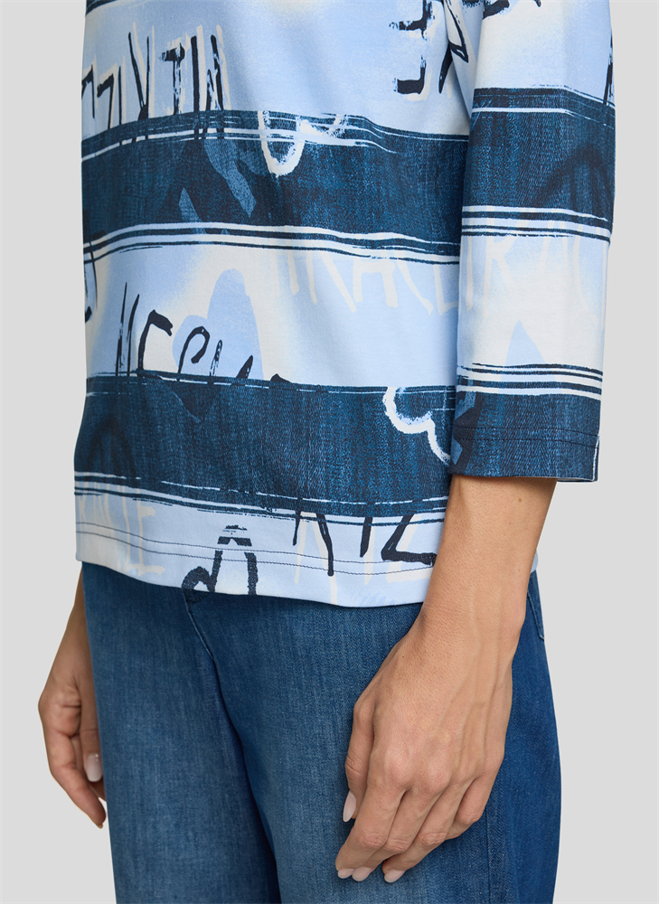 Dieses Shirt überzeugt mit einem modernen Allover-Print in Streifenoptik mit abstraktem Schriftzug. Der hochwertige Baumwolljersey trägt sich angenehm weich auf der Haut und sorgt für ein bequemes Tragegefühl. Der klassische Rundhalsausschnitt und die 3/4-Ärmel unterstreichen den legeren Charakter _ perfekt für entspannte Casual-Looks. Reine Baumwolle in Jersey-Qualität. 3/4-lange Ärmel. Rundhalsausschnitt. Locker geschnitten. Allover-Streifen mit Schriftzug.
