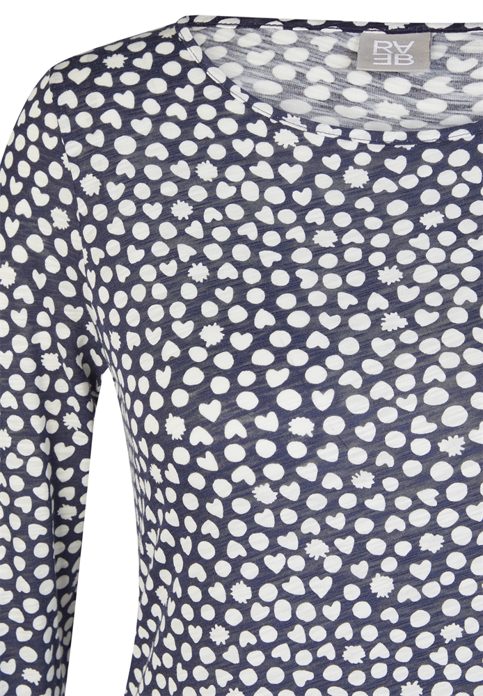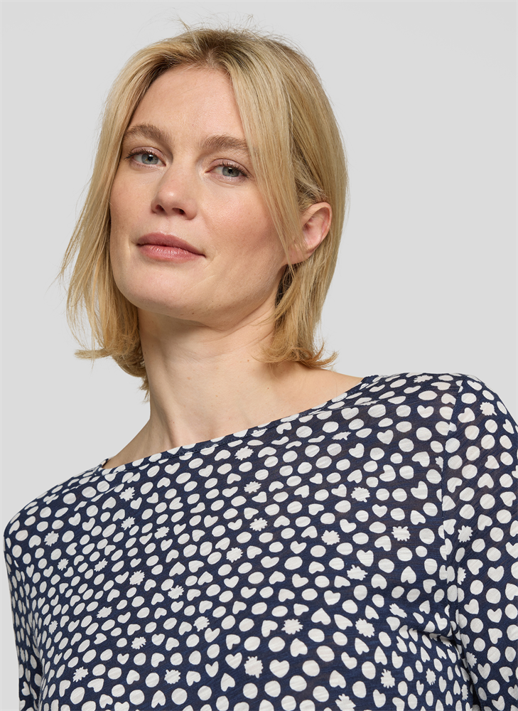 Mit verspieltem Allover-Druck und elastischen Details am Saum und an den Ärmeln ist dieses Blusenshirt ein idealer Begleiter für entspannte Outfits. Der weiche Baumwoll-Viskose-Mix liegt angenehm auf der Haut und sorgt für ein luftiges Tragegefühl. Der Rundhalsausschnitt rundet das Design klassisch ab. Elastischer Saumabschluss. 3/4-Ärmel mit elastischem Bund. Rundhalsausschnitt. Baumwoll-Viskose-Mix. Allover-Dessin mit Tupfenoptik.